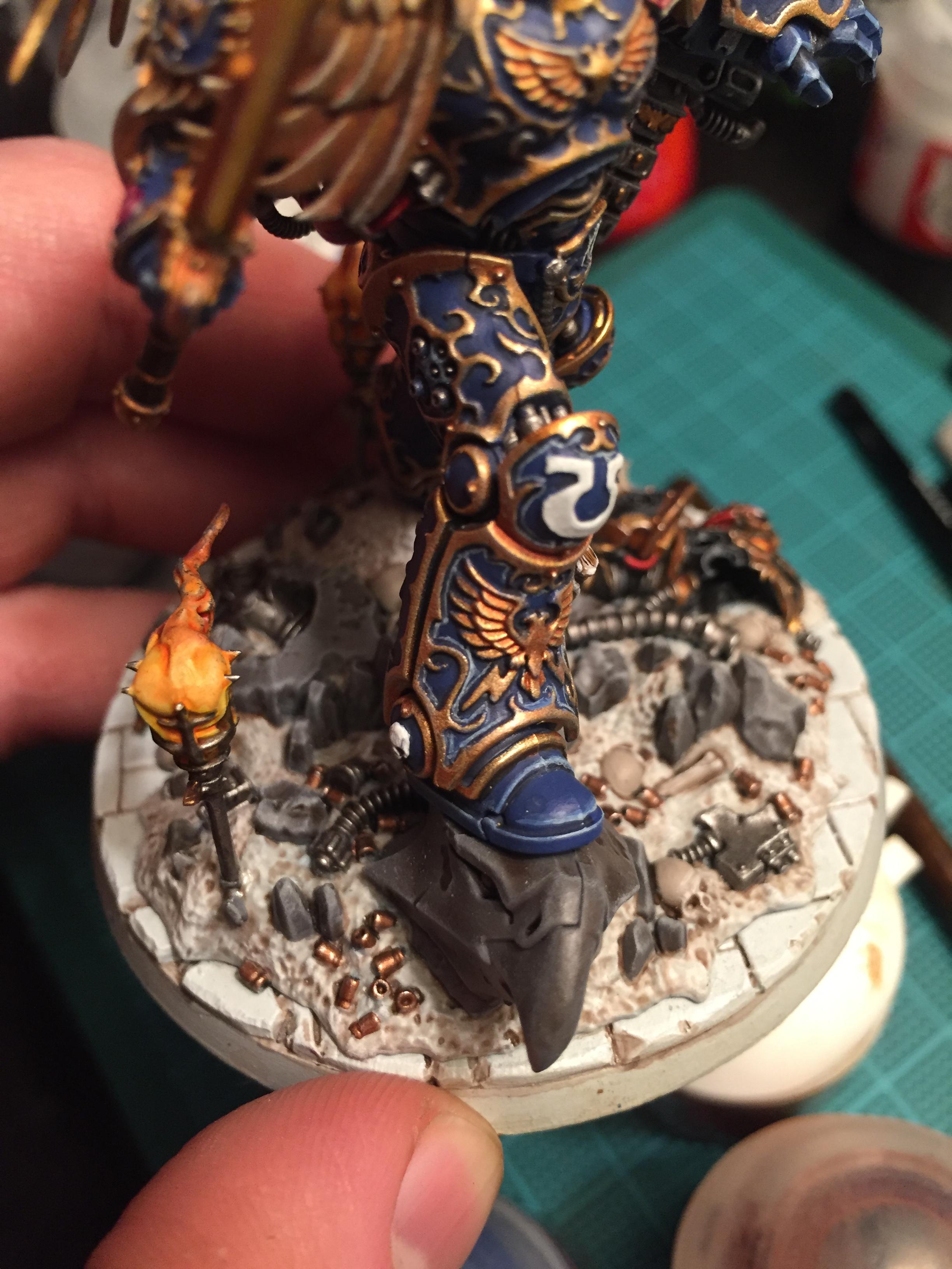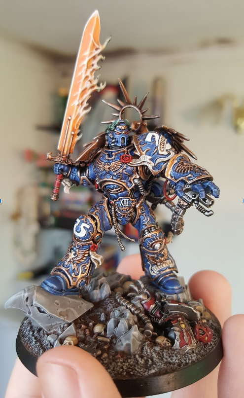 I went with the official scheme for the most part; Macragge Blue base, Nuln Oil, blocking Macragge back in then a first highlight of Calgar Blue and a second highlight of Fenrisian Grey, with Kantor Blue used to tidy up any spillage into shaded blue areas. The gold is one of the older schemes (thanks duncan) of Balthasar Gold shaded with Agrax Earthshade, layered with Ghenna’s Gold with a final highlight of runefang steel which is a real favourite of mine though it has the fairly serious demerit of looking absolutely terrible until you apply the runefang which can be a bit demoralising on a longer project, the reason being that ghenna’s is a very dark and orangey gold which doesn’t read as proper ultramarines until the silver brings it back up again. I’m not a fan of the more purple wax/electrum/whatever purity seals the studio paints these days so instead I go for the nice striking red of Khorne Red base shaded with agrax layered with Mephiston Red with a general highlight of Wild Rider Red and a point highlight of Troll Slayer Orange which provides an eye-catching colour for purity seals to be the accent pieces they generally are.The parchment seals and script in general were a Zandri Dust base hit with Agrax at the same time as everything else requiring it, followed by fairly thin Ushabti Bone layered in brushstrokes perpendicular to the parchments length without being too thick to give it some texture, with Pallid Wych Flesh as a highlight and then heavily watered down Rhinox Hide and a Size 0 brush to squiggle in script or write as required. The sword’s my least favourite part of the model paint wise, I’d unwisely started from a base of Jokaero Orange which turned out to be a touch too dark and worked that up towards fire dragon bright and troll slayer orange, with the streaks in the fire being Ushabti Bone with lines of White Scar with a small amount of thinned Abaddon Black