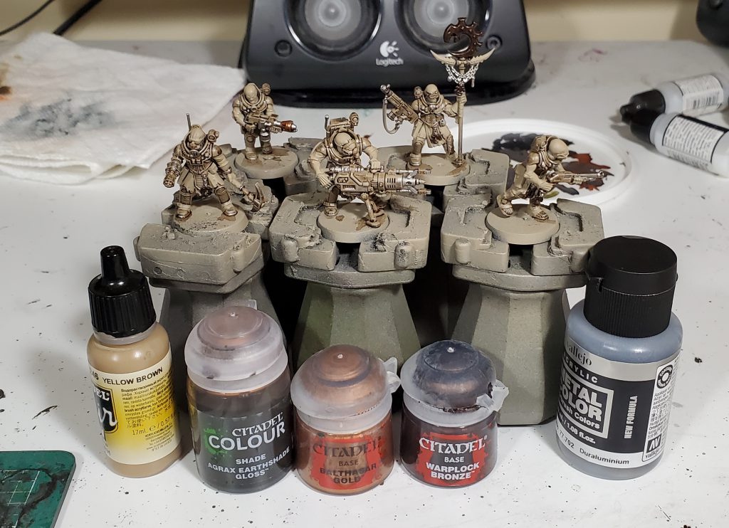 Next up, I washed the metal and armor panels alike with Agrax Gloss, this will get us the final sandy beige of the main armor and recess shading on the metals. After that dried, I went and cleaned up everything but the metals and armour with VMA Yellow Brown, this is needed becausein the last step you probably had excess chipping or weird textured areas. You could go straight to base coating with conventional colours, but I wanted to save time and I am happy with how contrast looks over the yellow brown.