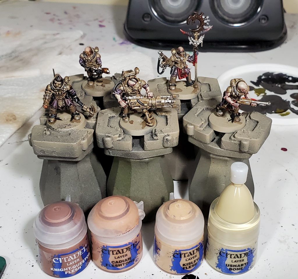 For the human skin highlight the colours are basically just moving left to right from darkest to lightest of this trio of paints. The darker skin is a couple of thin coats of Knight-Questor, then for the last highlight mixing in a touch of Cadian. The medium skin tone started with Cadian followed by mixing in a bit of Kislev for the final highlight of the medium tone. Then I reused that Cadian/Kislev mix for the initial highlight of the lightest tone that was then finished off with kislev.