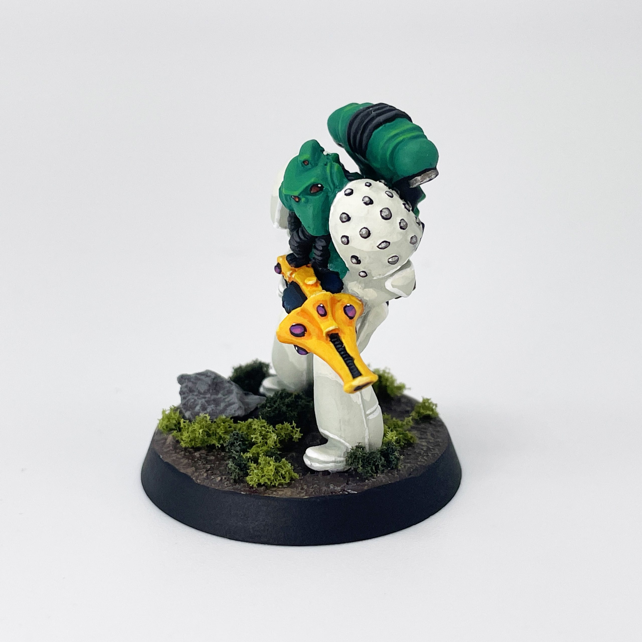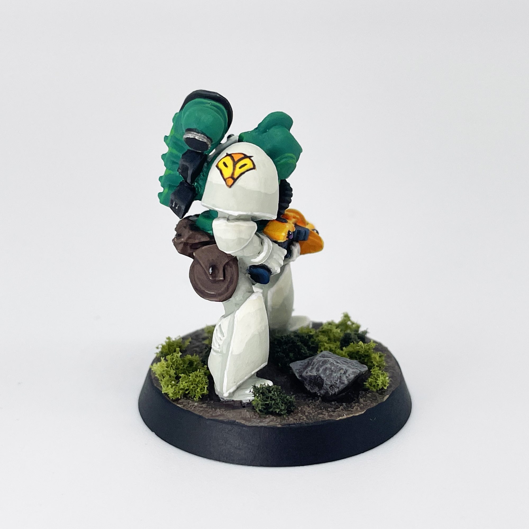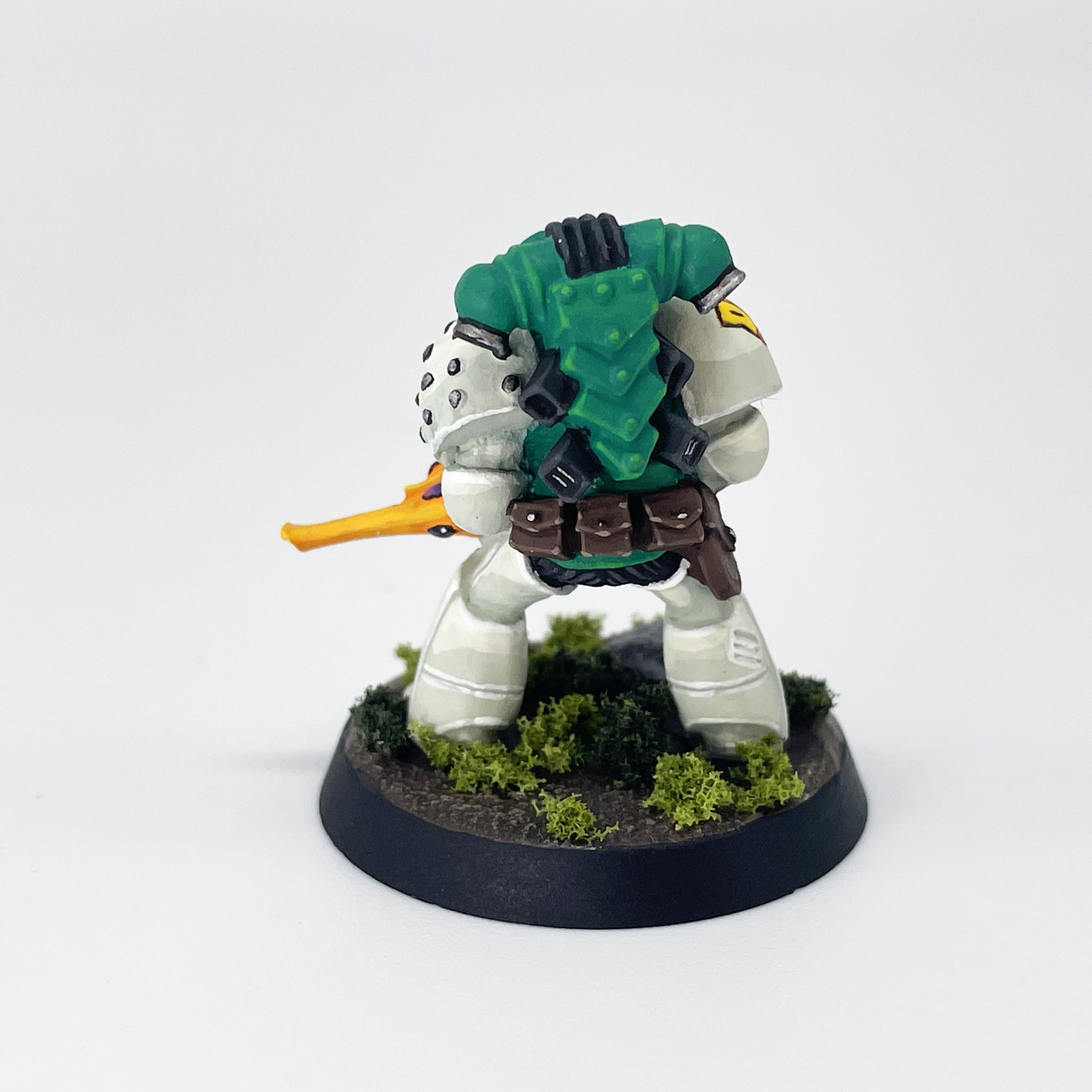 I won't walk you through the specifics of my basing because it is nothing special, just some texture paste and drybrushing. I did most of my basing before painting, with some green clump foliage added later as was the style at the time. Contrary to popular belief the 80s wasn't all Goblin Green bases, but in the Rogue Trader rulebook and contemporary photography it was generally a more realistic brown or grey with some green flock. I'd just recommend tackling any washing or drybrushing of your base before painting the model to avoid spillover onto the white armor.