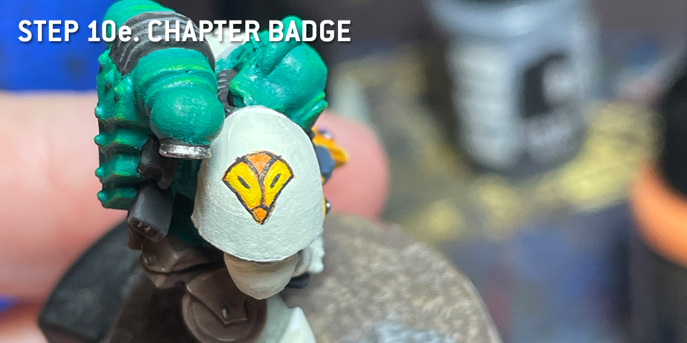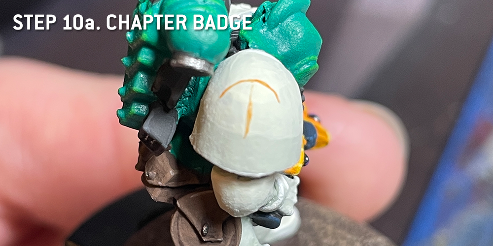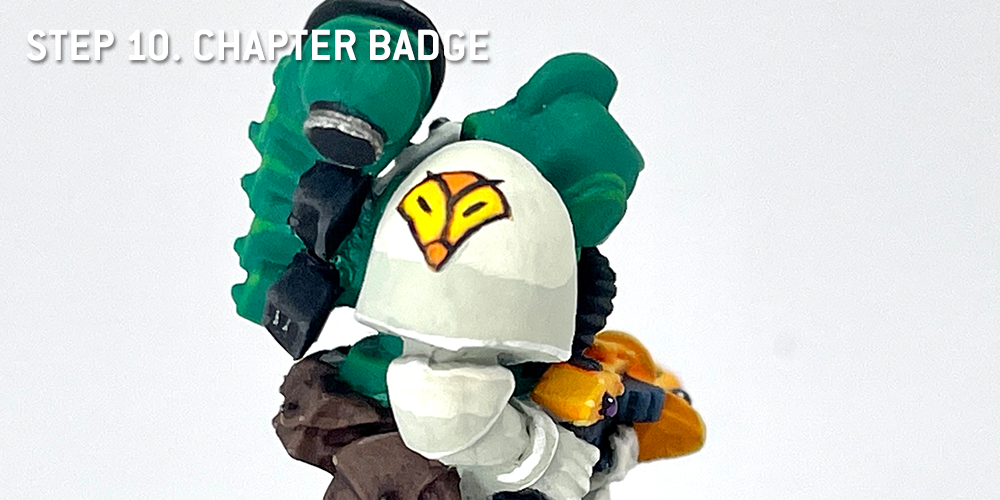 As there are no decals from the time for the Mentor Legion chapter badge, I thought I'd freehand my own. Fortunately, some Rogue Trader imagery exists for them, and the badge is fairly easy for a newcomer to freehand. Of course, other folks have made transfer sheets for home printing, but we're extra here at Goonhammer, and strong proponents of just going for it. I promise you, despite the subject matter, that I will not just tell you to simply Draw The Owl. You could also go fancy and highlight this too but I'm keeping it simple.