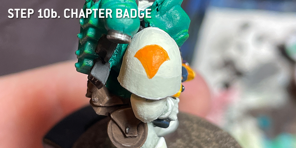 There aren't too many metals on this model because he's using an Eldar weapon, and I always imagine those as more organic or plastic than metal. However, he's got bonding studs on his pauldron and some details on his backpack to fill out. These are also the only Citadel colors I'm using today. We're going to let the Coal Black basecoat do the shading for us and skip the need for washes.- Silver Details