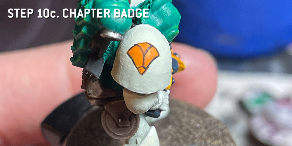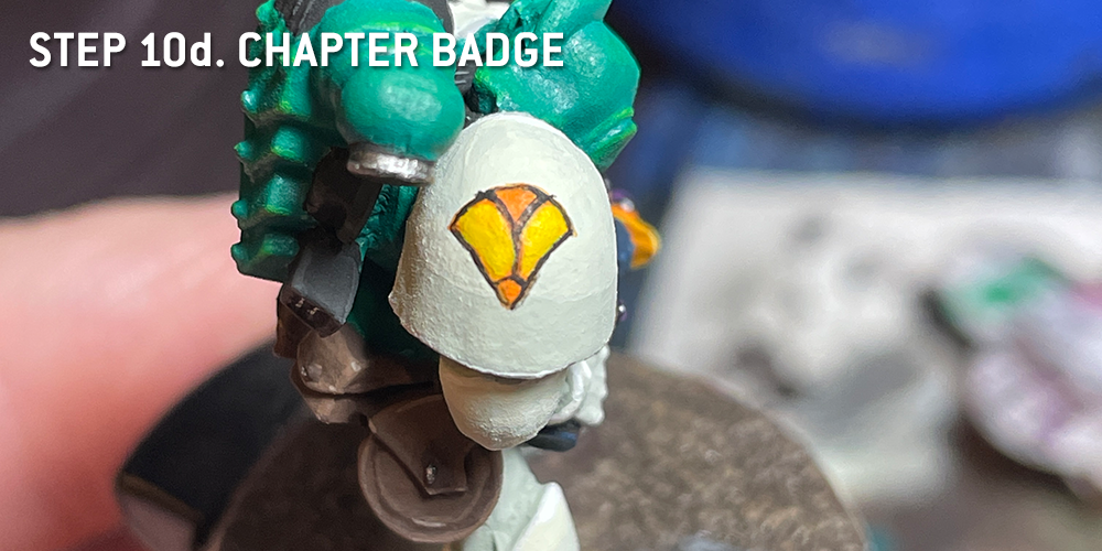 Step 10a: Using slightly thinned Orange, draw a vertical line centered on the shoulderpad, and then a half circle above that, which will define the top of your badge.