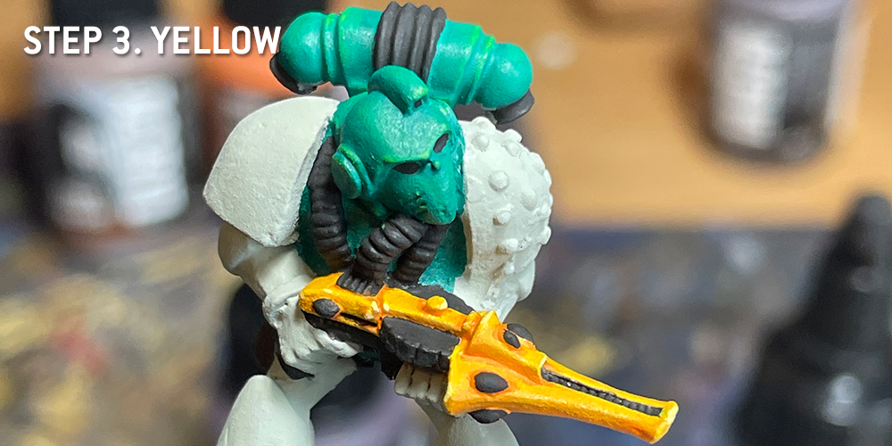 Photos from the time often showed Mentors with either black or gunmetal weapons. I'll have some notes on how to paint those colors in this article as well, but I wanted something with a load more contrast, so I did yellow instead. This was a common color on Eldar weapons of the time, and since this trooper has a Shuriken Catapult, that made sense to me. I also made a point to leave the orange on the underside and around the gemstones and doodads to really push the shading.- Yellow Weapon Casing