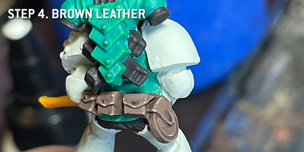I wanted a bright, warm leather color to stand out from both the piping and the armor, so I started with a medium brown - Dark Umber. This will of course be using more volumetric highlighting, but leather is a soft surface especially well suited to it.- Brown Leather