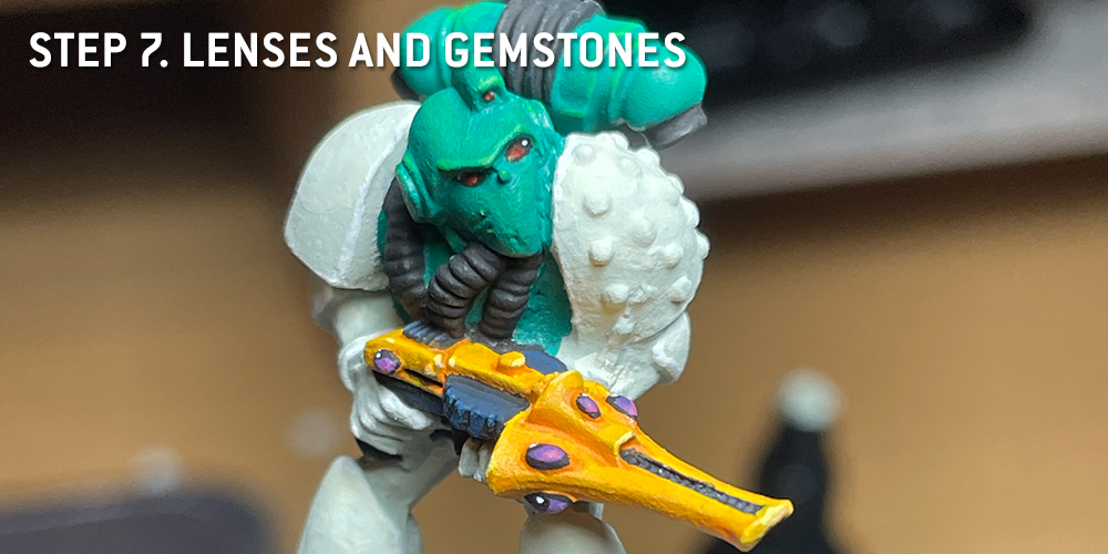 I wanted to save these for later, as I genuinely love painting them and they're a fun little victory lap for the model. Mentors usually have red lenses for their eyes, and that was an easy way to add more interest and warmth to the model. To emphasize both the alien nature of the Shuriken Catapult as well as contrast the yellow, I went with purple gemstones instead. As you've possibly noticed, I blocked these out in Coal Black early in the painting process so I'd be starting from a blank canvas. The goal with painting both is to paint progressively smaller and brighter halfmoon shapes towards the bottom or inner edge of the glass, with a white dot at the very top in an area you leave black. Rob's written more, better words about this if you want a refresher, or you can just look at these images to get an idea of what's going on.- Red Lenses