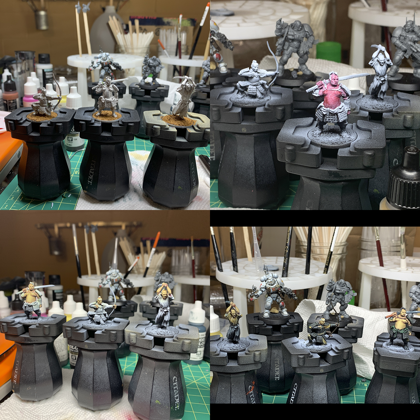 - For some final highlights I used VMC Light Green on the green, drybrushed some Scale75 Thrash Metal on the armor, and edge highlighted the robes with either Blue Grey Pale (for the black) or Ivory (for the khaki).