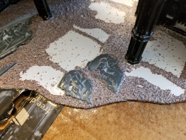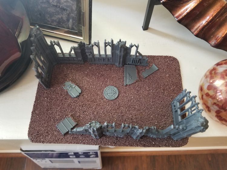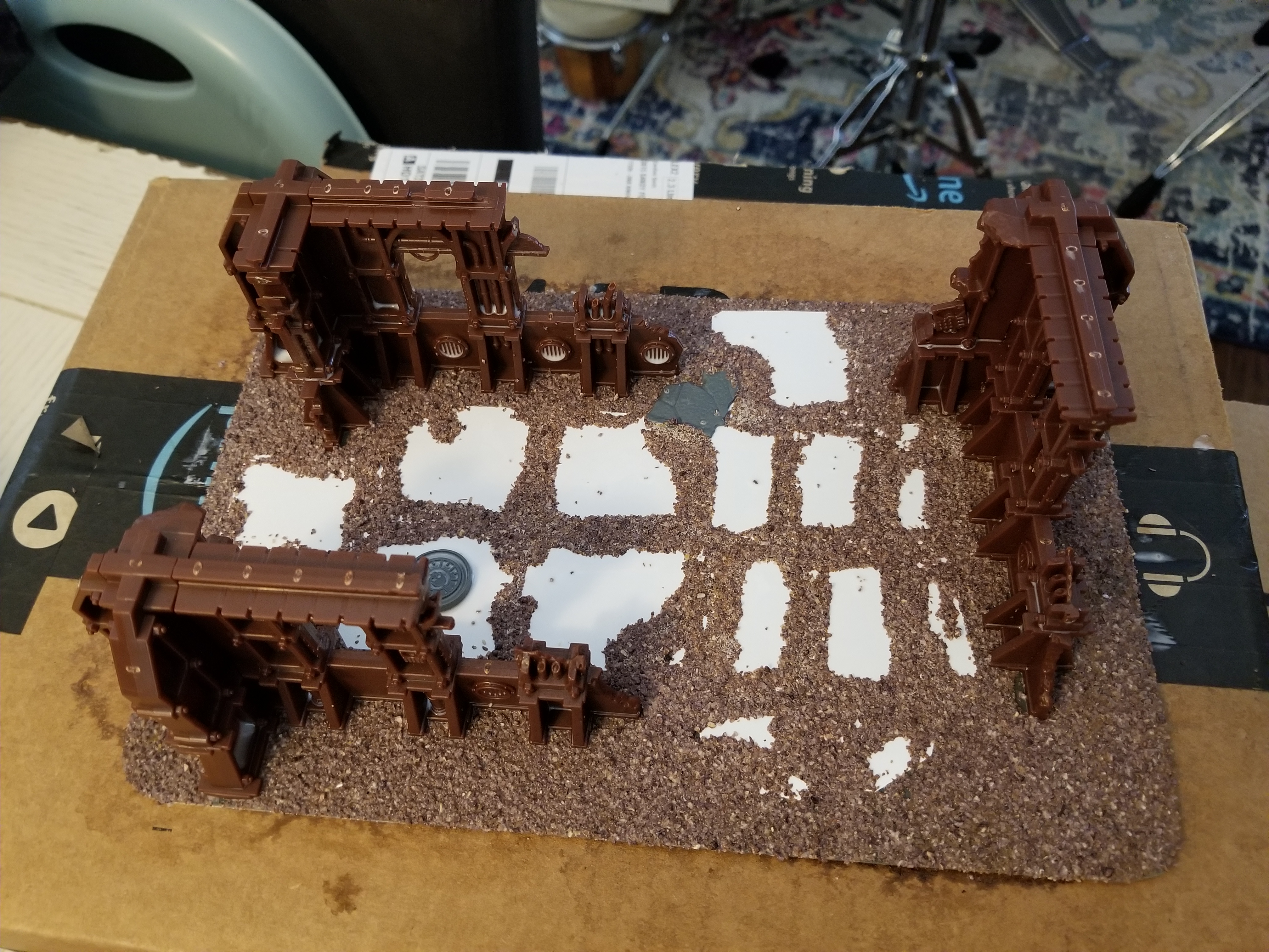 Credit: BuffaloChicken. This is from his jungle tutorial, but it's the same for ruins.One major upside to doing this is that the tiles already have an adhesive side. It's not strong enough to hold a building so you'll want to superglue those down, but it is strong enough to hold a layer of basing grit in place until you seal it. So start by laying that down, gluing down any details like plasticard panels or debris, then throw basing grit/sand on it and tap it off until you've got a solid layer. At this point I cover the whole thing with Woodland Scenics spray adhesive, AKA watered down PVA glue in a spray bottle. Coating the whole thing with this seals the model and keeps everything in place so I'm not constantly losing grit over time.