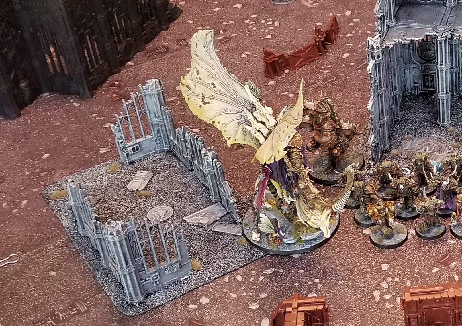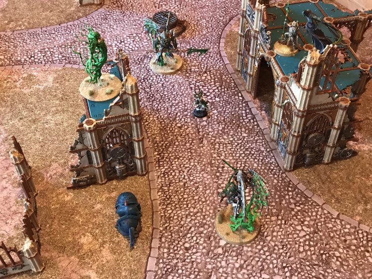 - Weathering – I painted the bottom third of the ruins (or so) with Typhus Corrosion, making sure to hit any spots where I messed up and went outside the lines, and also hitting all of the parts painted with leadbelcher. Then I hit the copper plates with Nihilakh Oxide.