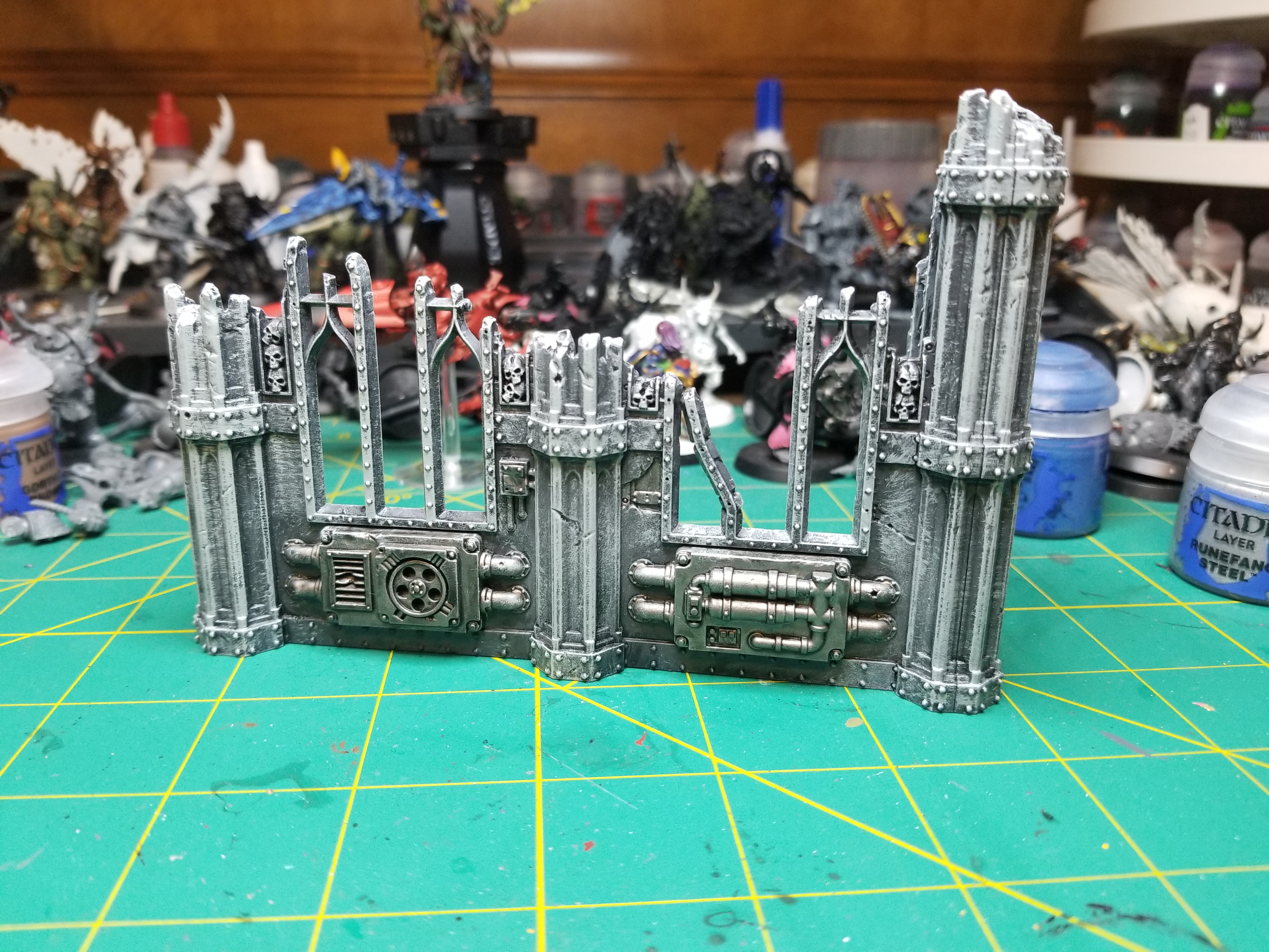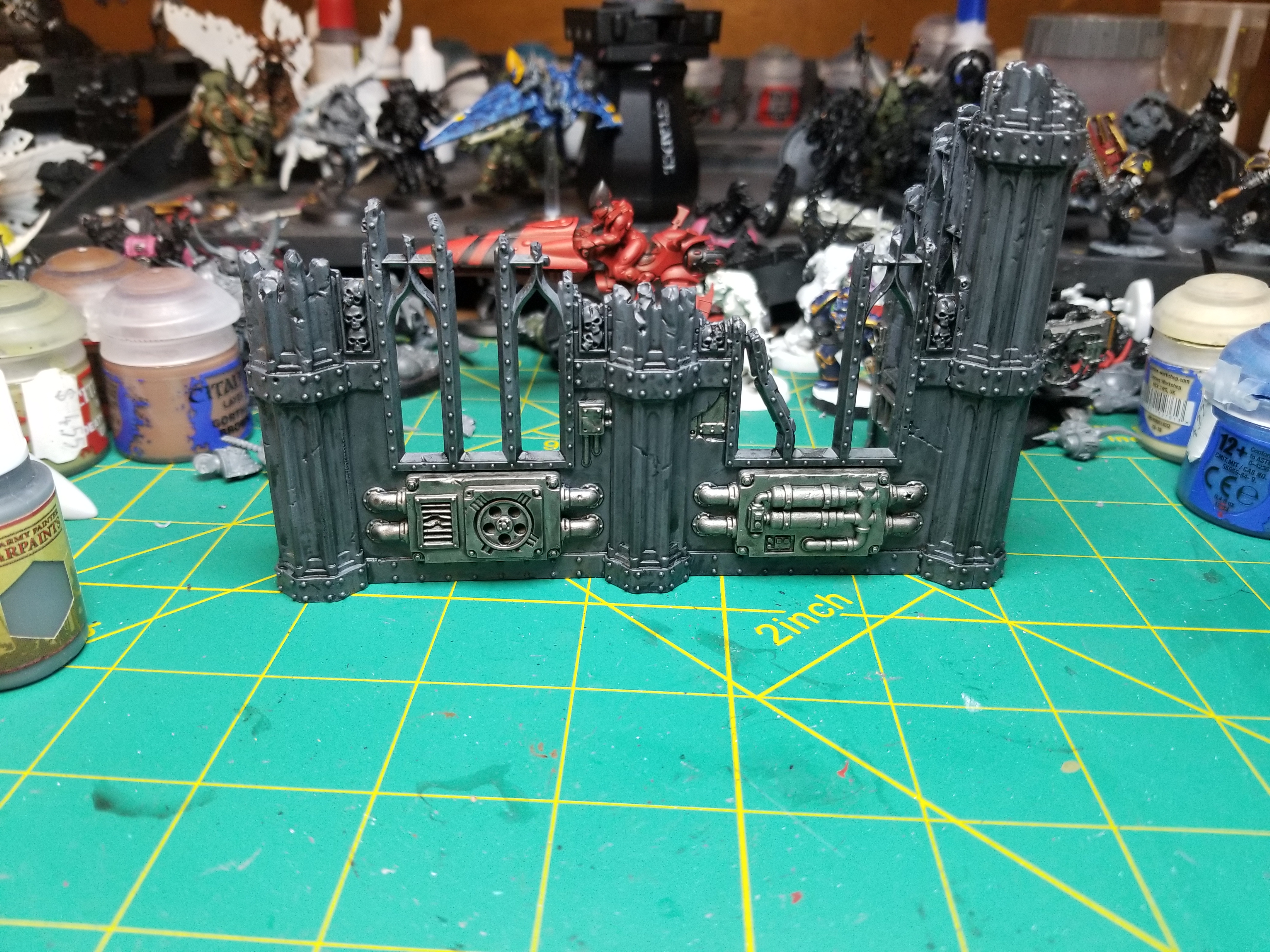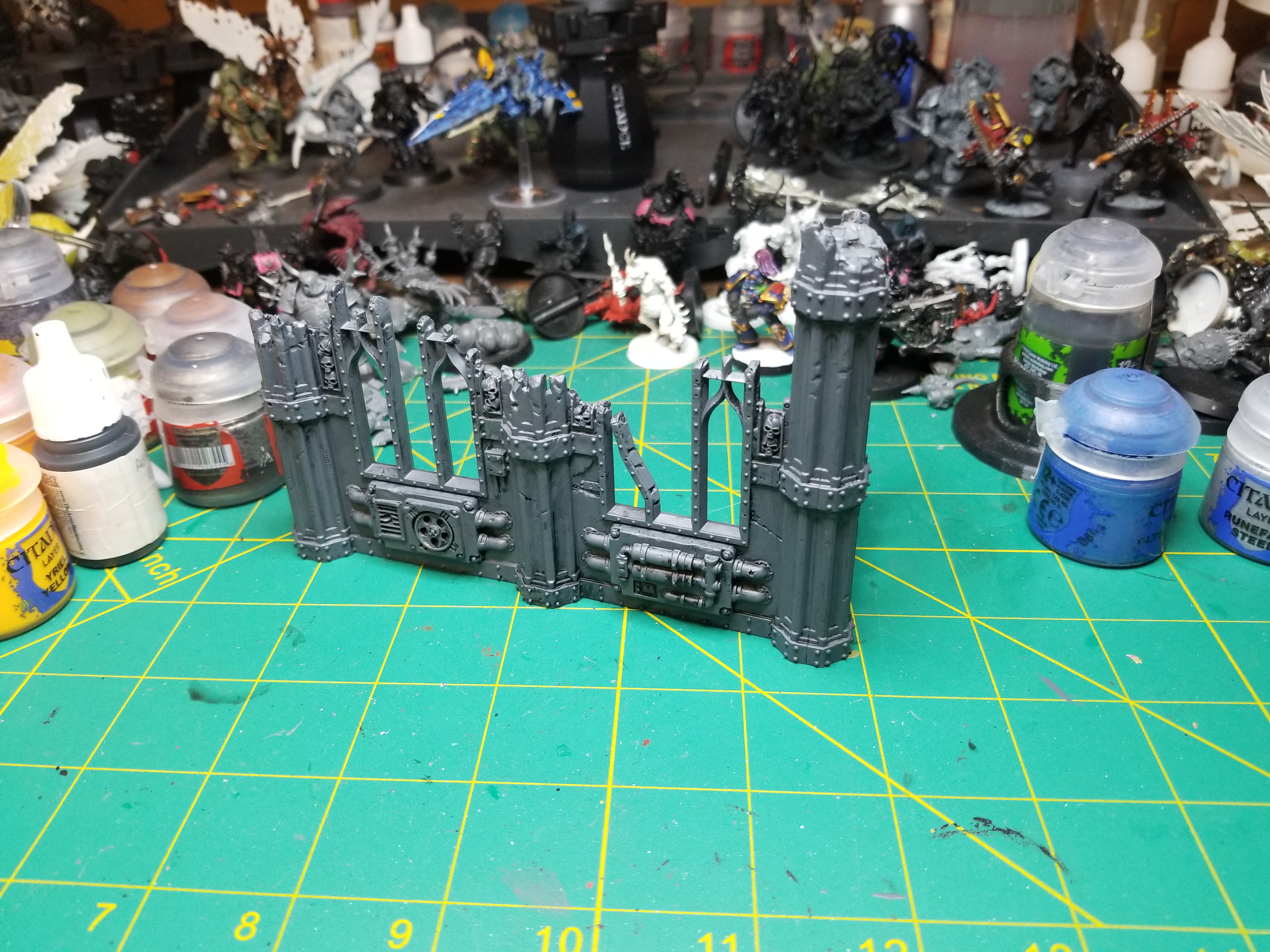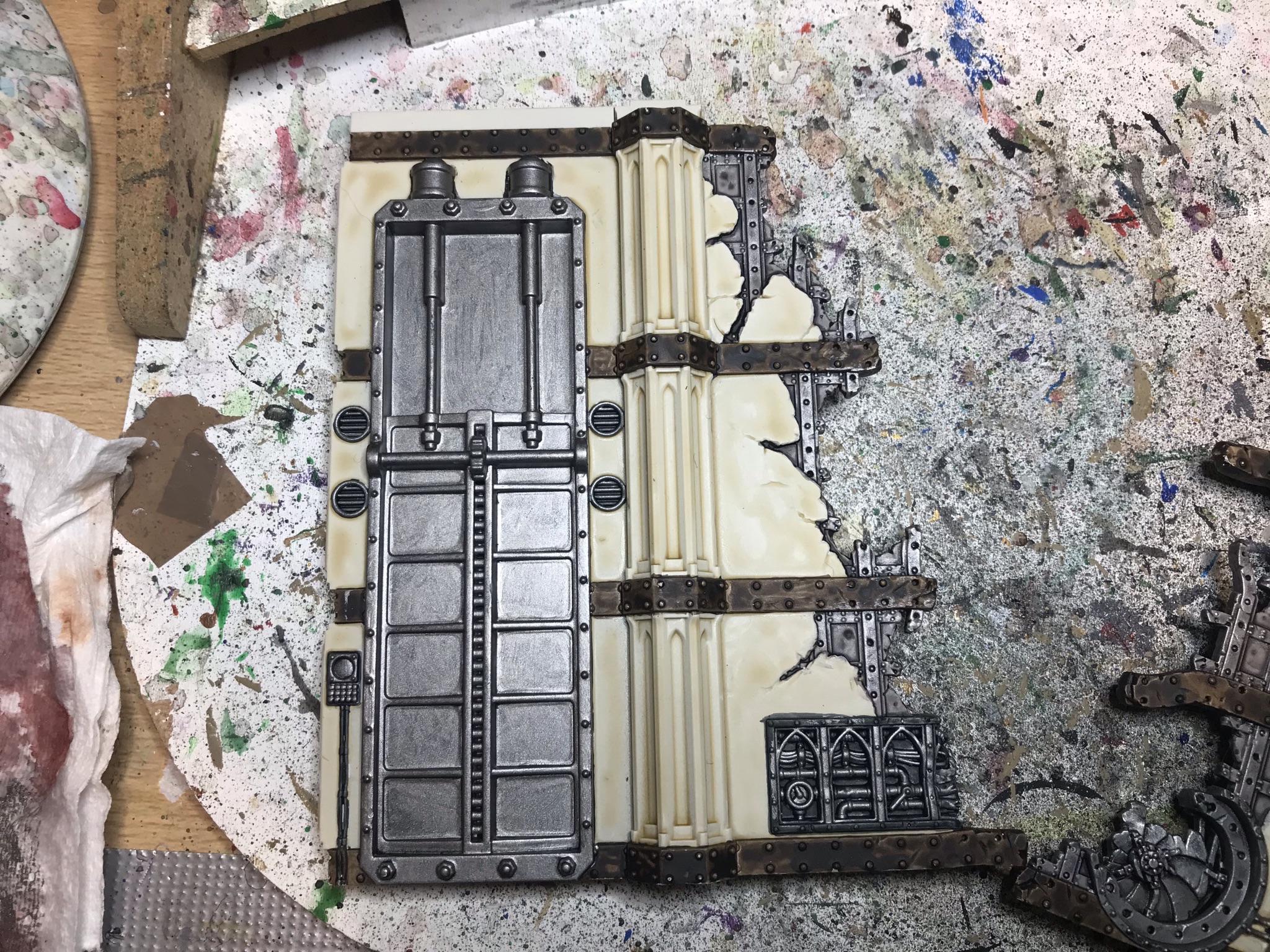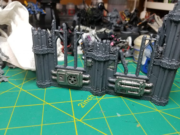 - Paint the most prominent pipes and grates with Leadbelcher. Get some of the wires and exposed pieces of rebar, but I’m not trying to hit everything -just the big bits and something on every face.