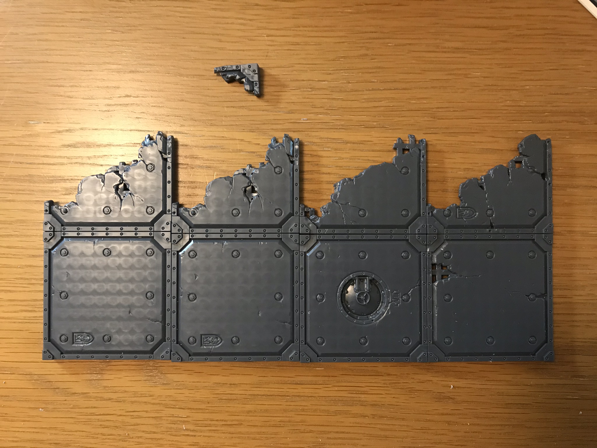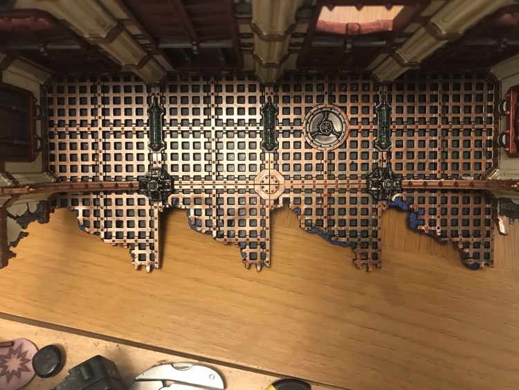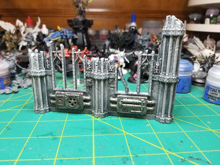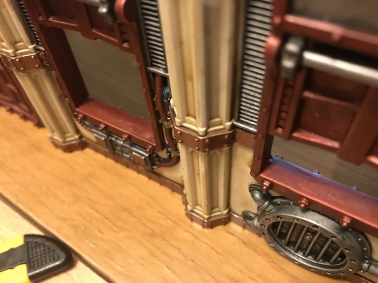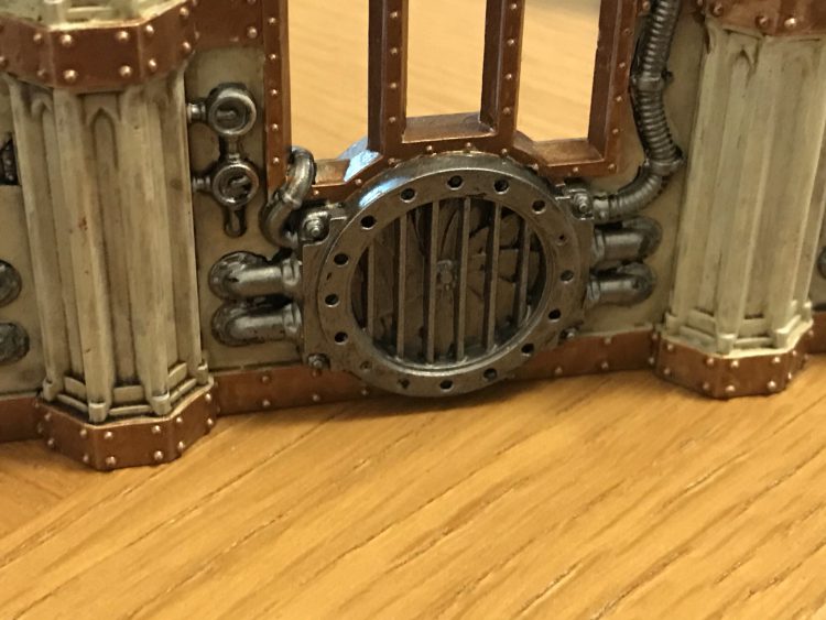 Finally, I added detail to the AdMech panel. Having washed it in Agrax, I painted the Mechanicus symbol in Stormhost Silver, then applied thinned Black Templar over half of it to give the effect from the box art. I applied Gehenna Gold to the trim and the lettering and, at last, the walls are done!