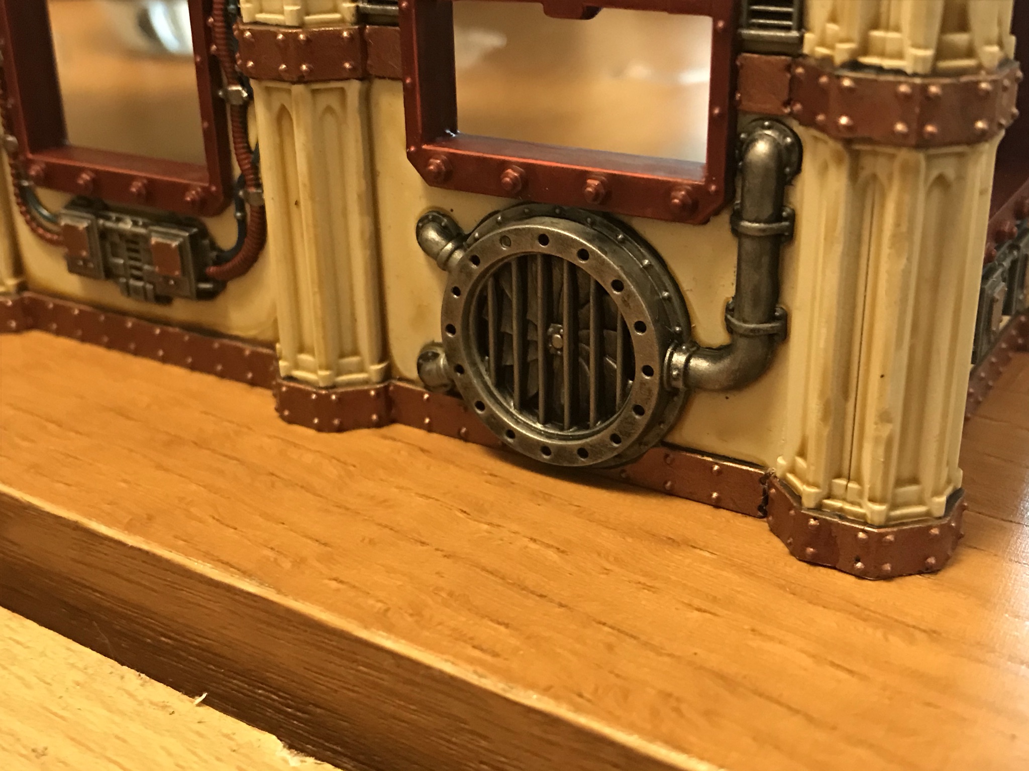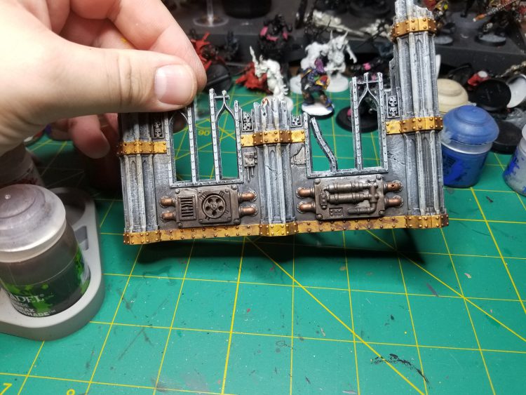 - Paint the metal plates and Window grates with Balthasar Gold. Again, I don’t need to get everything here but just enough to add a third color.