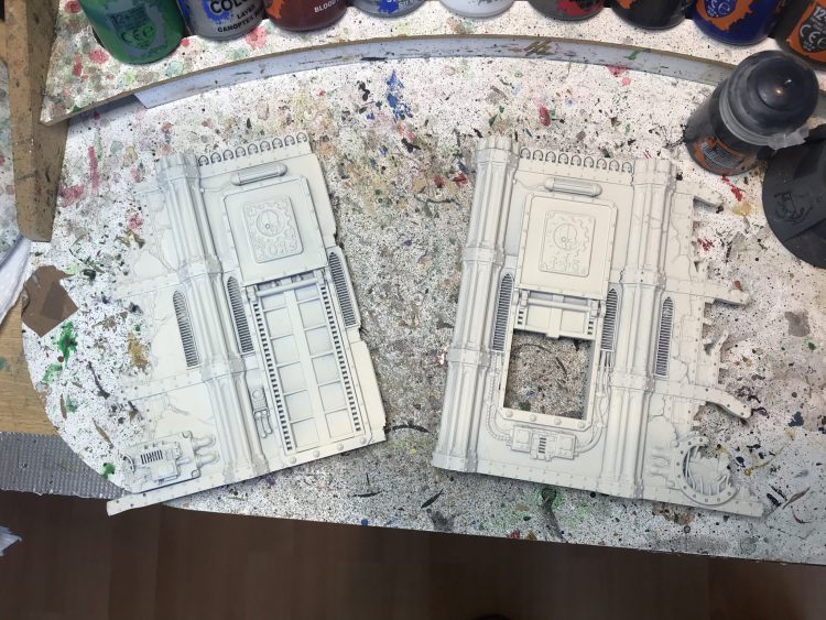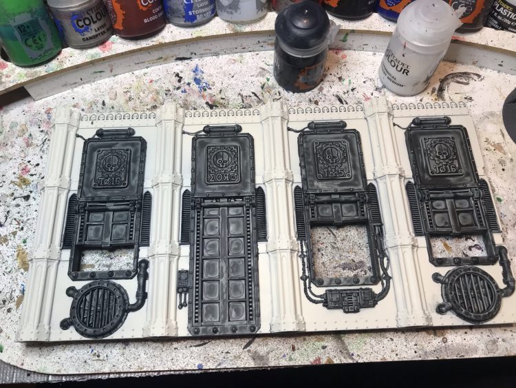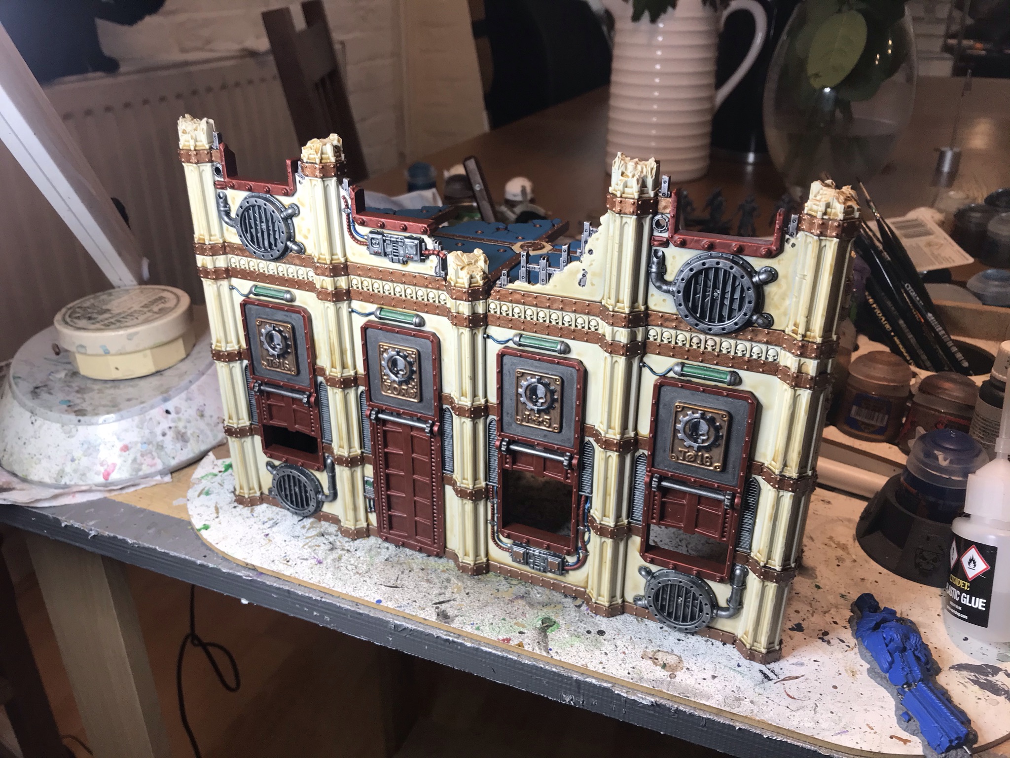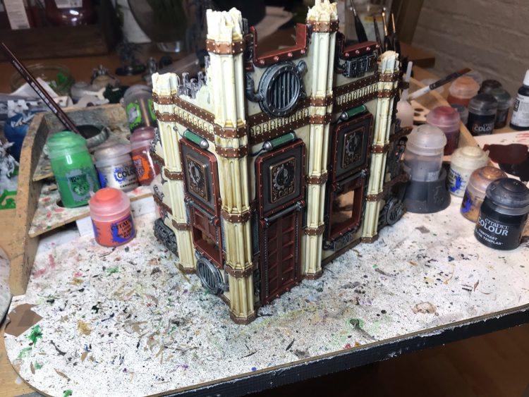 The Sector Imperialis kits are great. I've painted too many of them so far, and I still have more to assemble and paint. Painting terrain can be a real blast - you can get away with a lot of stuff you normally couldn't on minis, and being sloppy to save time isn't the end of the world. Generally speaking, I'm of the philosophy that the models are the stars and the terrain is merely a stage for them, so you should purposely put a bit less time and color into your terrain in order to give the models more of an opportunity to pop. And also to make it easier to tell what's going on with the table from a distance. This means that I generally try to make my terrain pieces a single, more muted color, but when it comes to making them look finished and detailed, what you'll find is that a little goes a long way - picking out a few small details with additional colors will make a piece of terrain look much more detailed and finished, to the point where you don't have to do the whole thing if you hit the right details or add the right pop of color.I'm going to walk through my basic method for painting buildings, then talk about how I do bases for them. Because in 9th edition, terrain really wants to be based. Also I'm going to avoid the building and modeling steps. Wings covered those and if you want more we'll likely cover it in a future Fabricator General article, In the meantime, I'd strongly suggest checking out Ray Dranfield's Twitter for some pretty amazing tips on how to use the terrain kits and combine them. My only note is: Don't worry about the mould lines. The only areas you need to be diligent about scraping and cleaning are the points where walls and floors will make contact with each other. Non one is gonna see the mould lines in your windows.