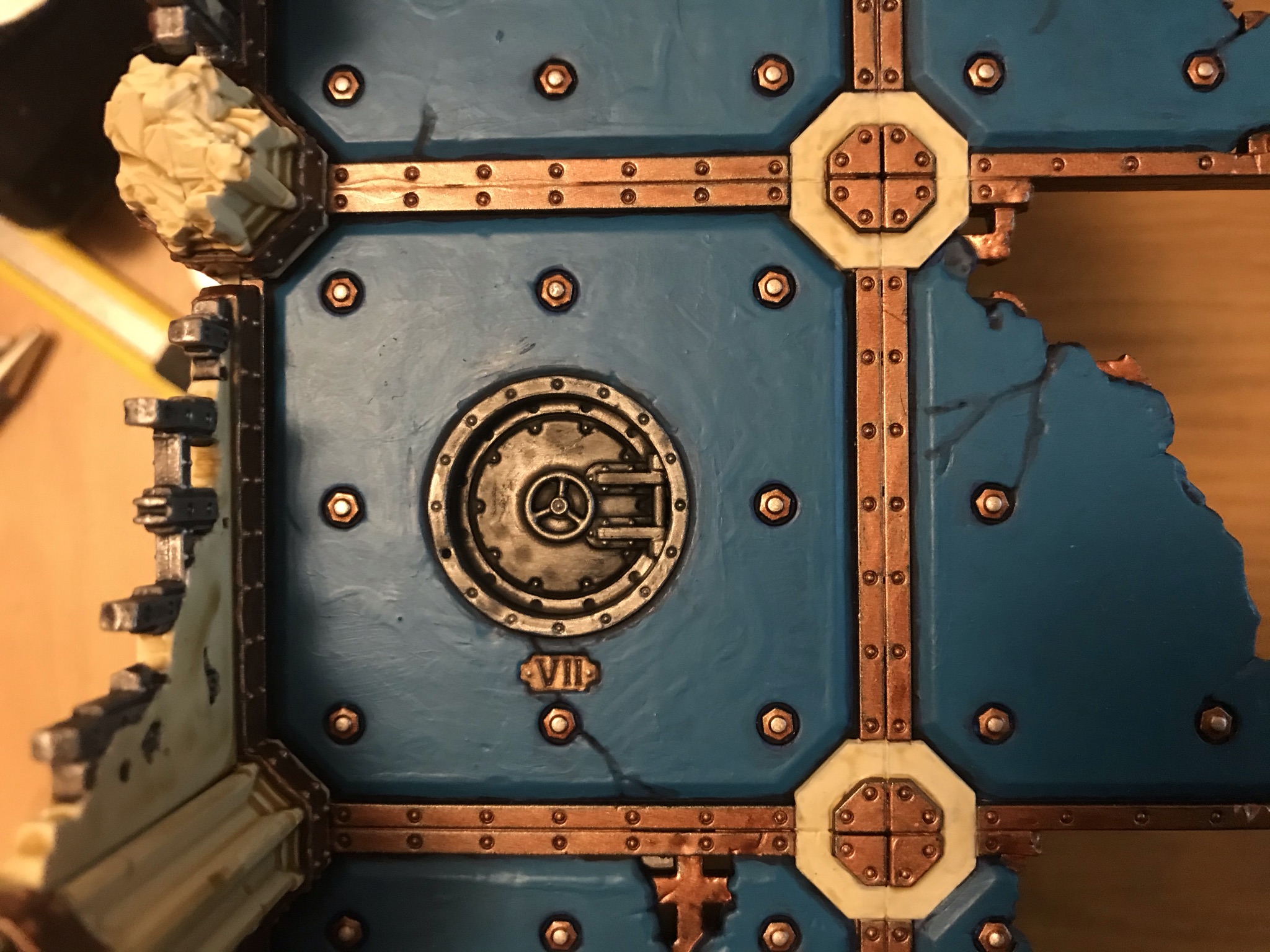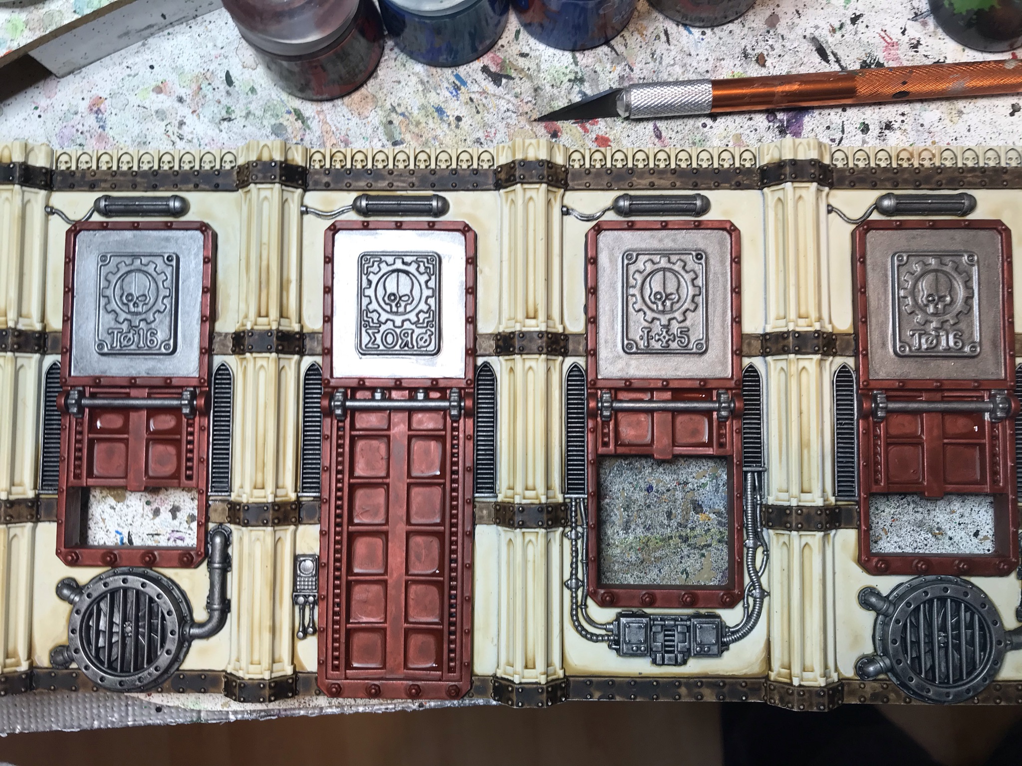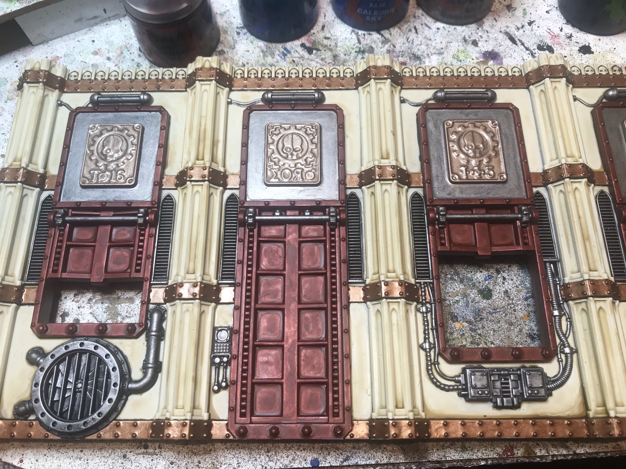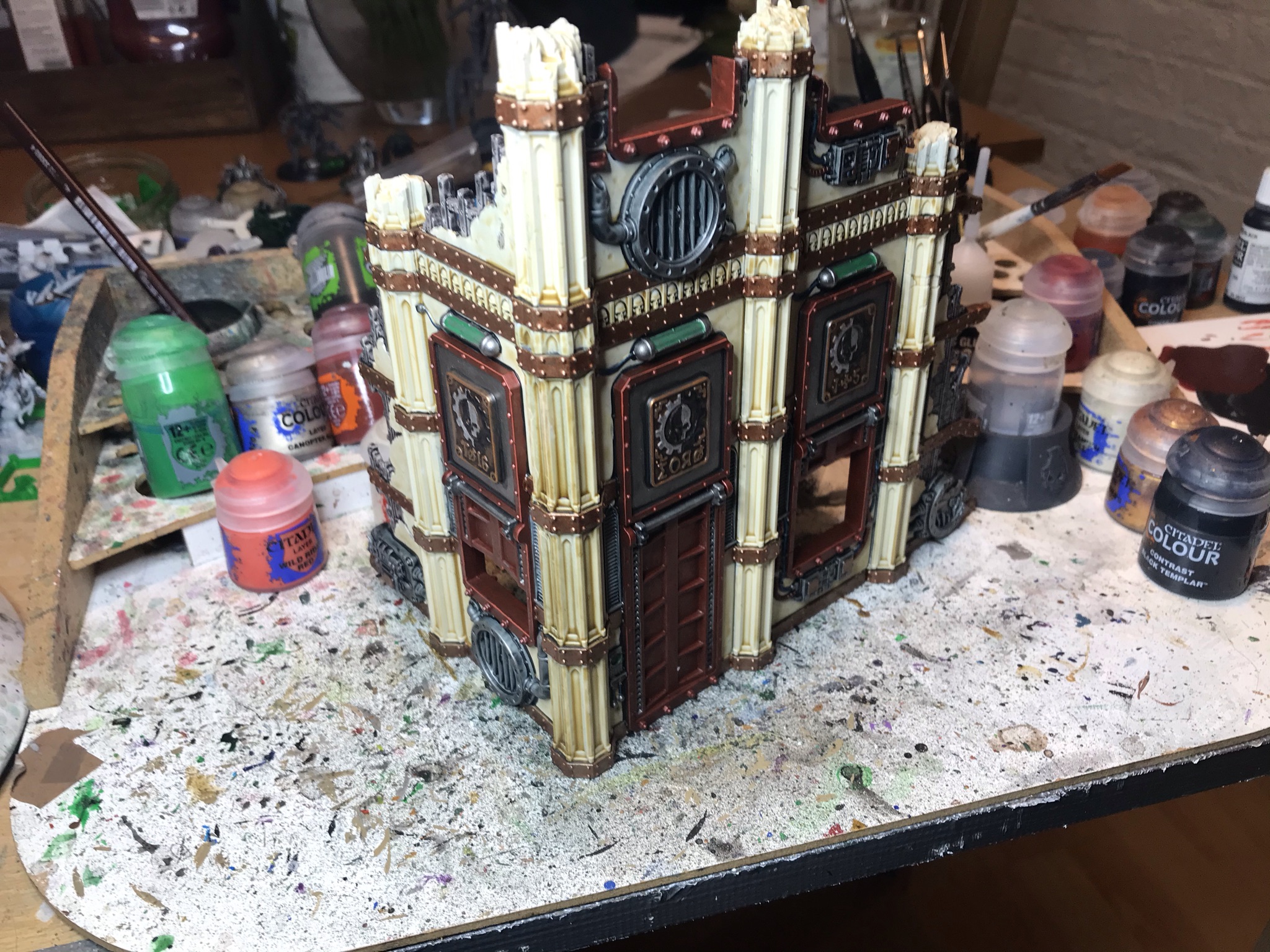 Credit: WingsThe good news is that at this point, you're maybe 2/3rds done - there's only one "long" step left and that's painting the red on the doors, which we tackle next. For this, it's once again Contrast time, here Blood Angels Red thinned about 50:50 with Medium and applied generously. The way I tend to do this is apply it to the flat first with a big brush, as you don't need to worry about being neat, then go back round the edge with a smaller brush to avoid getting red onto the stone or metal panel at the top of the door (which I'm leaving silver). If you do smudge onto the stone while doing this, you can quickly wet a brush and mostly wash the red away/capillary action it up if you're quick enough. This takes you to the following: