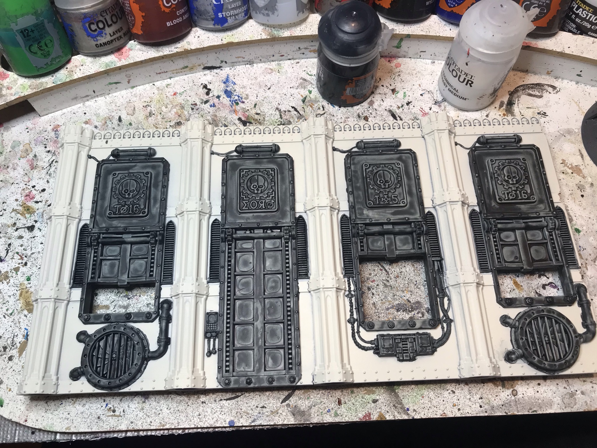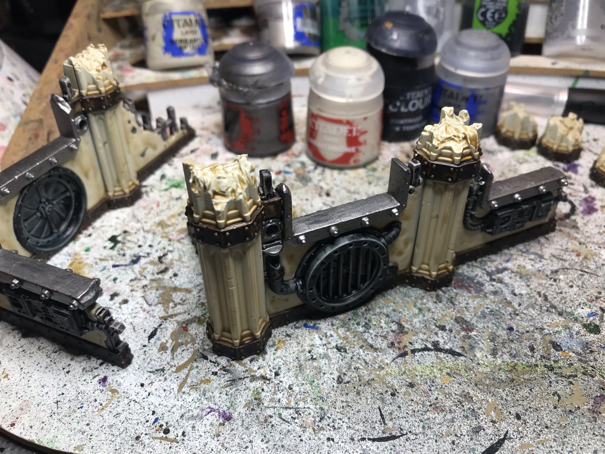 Next up, the longest and by far the most boring step - blocking in various sections in contrast. This is, honestly, why if I could go back in time and do my original ruins from scratch I'd choose a dark stone colour, because with beige stone and metal detailing you either have to spray black and re-base the panels (which would be horrific) or do what I'm doing here and spray bone/white and block in the metals. The latter is, at least, merely time consuming rather than actively hateful, so I got to work. For anything that was going to end up silver or red, I applied thinned Black Templar, mixing it up about 50:50 with medium in a big puddle on my pallate pad.