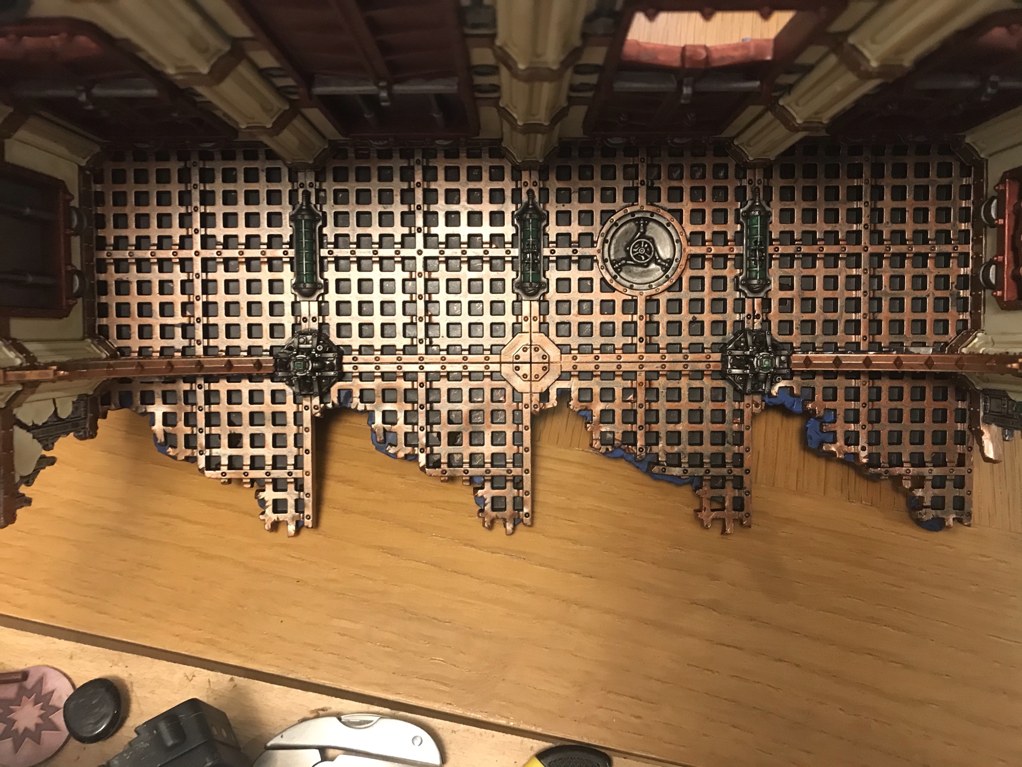 Credit: WingsFrom here, you could basically just wash those panels Agrax and this would be good to go, but by this point you've probably already invested way too much time here, so adding some light detail to really make them pop is a good investment. I use Blood Angels Red and Talassar Blue to make various wires, pipes and buttons either metallic red or blue, and use Hexwraith Flame to fill in the cage lights. and display screens.
