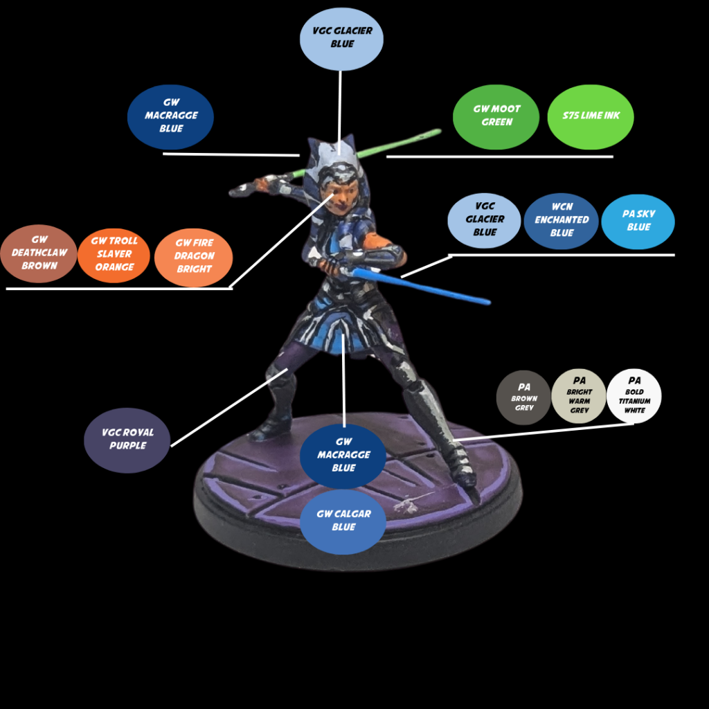 - For her two lightsabers, I based them both with Vallejo Game Color Glacier Blue, and then used Warcolour Nostalgia Enchanted Blue and Vallejo Model Air Light Sky Blue on one of them, and used GW Moot Green and Scale75 Lime Ink on the other.