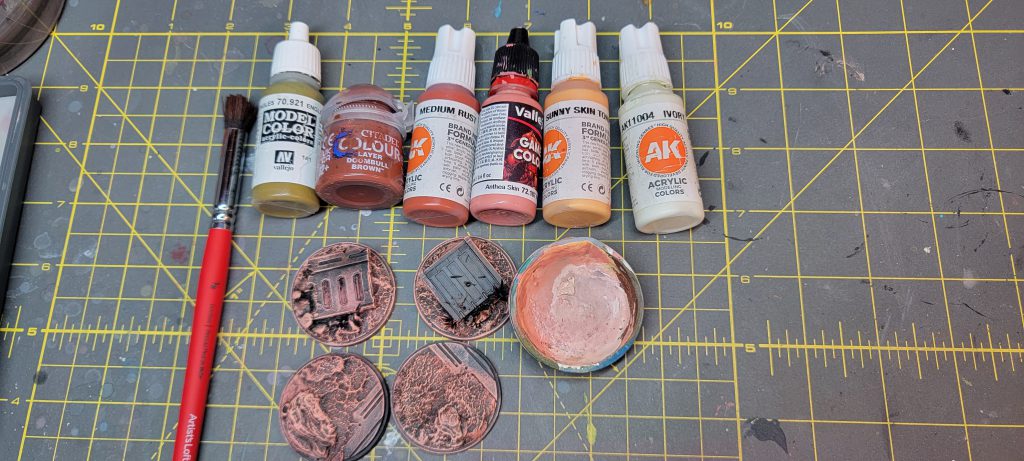 Once the Milliput dries, I prime everything black. I will build up the color of the base using a large, round dry bush. Starting from Vallejo Model Color English uniform, and making my way through AK Interactive Medium Rust, Vallejo Andrea Skin, AK Interactive Sunny Skin Tone, and finally Ivory. With drybrushing, I will mix each subsequent color in a metal palete, which helps mix and blend between the steps. Once dried, I use a combination of Vallejo brown and rust pigments. When working with pigments, you need a clean large brush to roughly apply them to a completely dried base. Then, follow up by applying a setting agent like Mineral Spirits to the entire area. The mineral spirits will take a few hours to completely dry, but once dried, the effect is that your pigments will create a unified wash type effect. Some pigments will have settled into recesses and will appear to create a dry, dusty effect.