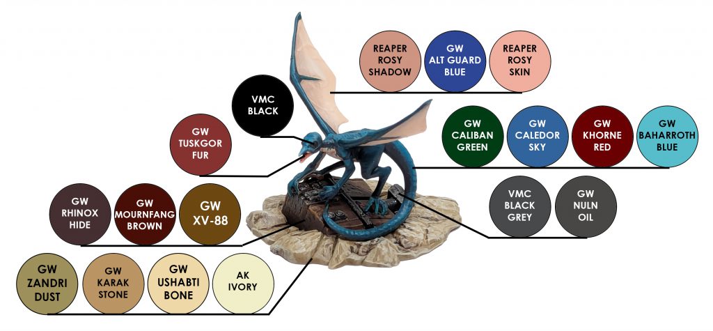 Basecoat - Reaper Master Series Rosey Shadow Shadows - Reaper Master Series Rosey Shadow: Citadel Altdorf Guard Blue Highlights - Reaper Master Series Rosey SkinThe underbelly and wing membrane of the Bogwing started with a basecoat of Rosey Shadow. I painted the shadows with a mixture of Rosey Shadow and Altdorf Guard Blue and then gave it a highlight of Rosey Skin.