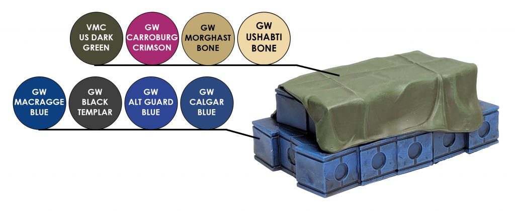 Basecoat - Citadel Macragge Blue Spray Primer Recess Wash - Citadel Contrast Black Templar Drybrush - Altdorf Guard Blue Drybrush - Calgar BlueThe cargo boxes were primed Macragge Blue. I then used Black Templar and did a recess wash in all of the panel lines some shadows where the tarp lies. Once the wash was dry, I drybrushed them Altdorf Guard Blue and Calgar Blue.