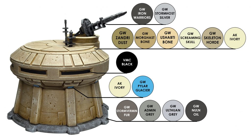 Basecoat - Citadel Zandri Dust Spray Primer Sponge - Citadel Morghast Bone Sponge - Citadel Ushabti Bone Sponge - Citadel Screaming Skull Recess Wash - Citadel Contrast Skeleton Horde Drybrush - Citadel Screaming Skull Drybrush - AK Interactive IvoryThe Outpost is mostly sandstone colored, so to make it easy on myself I started with a basecoat of Zandri Dust spray primer. Using a sponge, I applied Morghast Bone, Ushabti Bone and Screaming Skull to the surface. Once I was happy with the coverage, I did recess washes and a surface wash of the sides, feathering out the paint as I went up. Once the Contrast paint was dry, I drybrushed the building with Screaming Skull and Ivory.