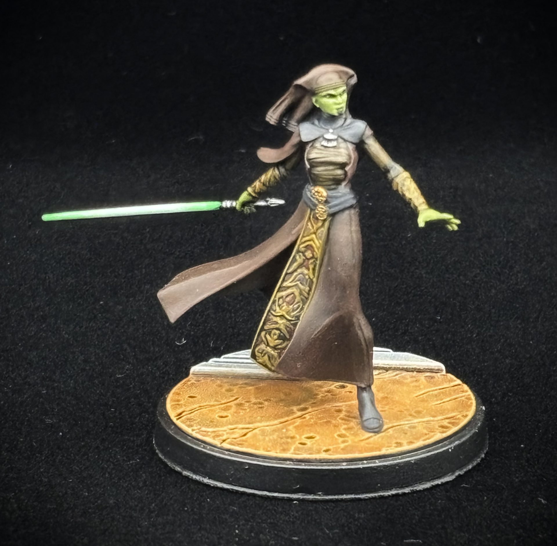 - Robe: This is the biggest single area on the model; fortunately AMG has given us a model with a lot of lovely folds and creases to make what could have been a boring sculpt more interesting. I opted for a strong reddish-brown color to differentiate her from her master while still staying in the same earth tones range. As a side effect, it also speaks a little bit to the reddish Geonosian soil I use for the bases, which are kind of a nice midpoint between the ochre on Luminara and the red in Barriss’s robe. Take your time with this step; it’s the majority of the model, so it’s going to take a bit, but it’s worth it. You can also- as I have- employ some slightly “chunkier” highlighting here to emphasize the folds, as long as you follow their lead. I also used this color for the little tip of the headdress underneath her hood. (Base: PA Mahogany; Highlights: PA Burnt Sienna and Citadel Doombull Brown in increasingly lighter layers.)