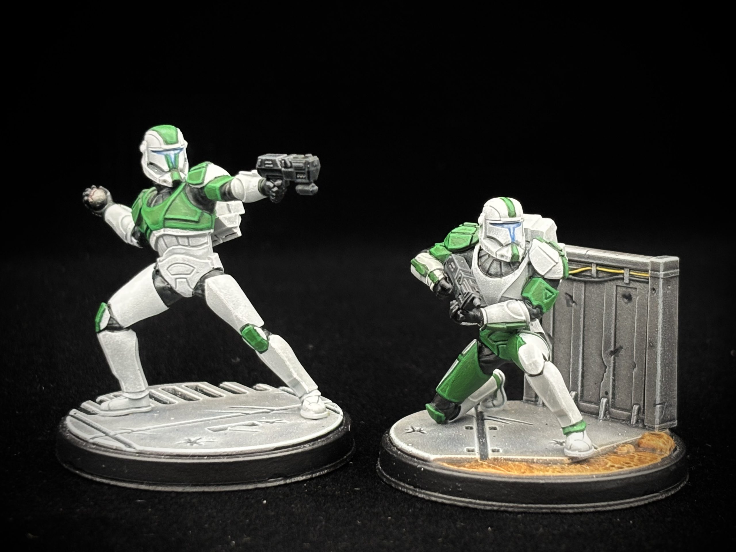Lastly, time for armor markings. There are no rules here, and if you’re like me, you may be getting ready to repaint these guys, because you originally did them up as Boss and Fixer, but now Delta Squad actually exists…anyways, I decided to go with green, because Luminara’s clone command is the 41st Elite Corps (you can see them in glorious action getting decapitated by Yoda on Kashyyyk at the end of Revenge of the Sith), and that’s their color. There isn’t really any official rhyme or reason to the markings on clone armor beyond color, and in fact is a big part of the way soldiers express their own individual identity, so you can kind of make this up as you go. My rule of thumb is that I block in colors one area at a time and then step back from the model to look at it as a whole, and stop when it seems “right.” All your usual rules about color arrangement, especially making visual triangles, apply here (you’ll notice my standing clone has his upper armor markings centralized and the lower armor ones out on the kneecaps, while my crouching one has the inverse- centralized on the legs and out on the shoulders). The process is simple- block in with a thinned down darker base, wash if you like but be careful because you can really easily ruin the white if you mess up, and then highlight. For my money, I usually skip the wash. What can I say, I’m cautious by nature. (Base: Caliban Green; Highlight: 50/50 mix Caliban Green and Warpstone Glow/PA Green; Edge Highlight: Warpstone Glow/PA Green)
