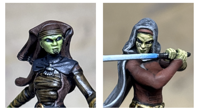 - Tattoos: Both Jedi have tattoos that are an important cultural record of a Miralan’s accomplishments; Luminara’s on her chin and Barriss’s on her cheeks. Now, you could agonize over trying to use a microscopic brush to render these in exacting detail…but I didn’t. I used the same thinned black paint I used on Barriss’s cloak to put a trio of black diamonds on each of Barriss’s cheeks and to dot the pattern on Luminara’s chin and called it a day- the overall effect creates the look perfectly from the tabletop, and honestly trying to do more could end up making the model look too “busy” and detract from the overall effect unless you’re an absolutely ridiculous painter, at which point you don’t need my notes on how to do this anyways!