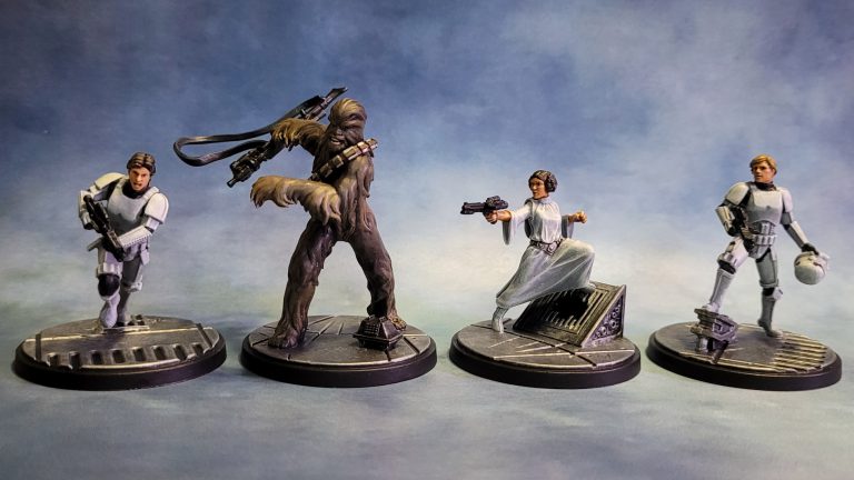 As is usual for Shatterpoint kits that don’t include battle droids, assembly was reasonably straightforward. The only model in the set that was at all tricky was Princess Leia – my primary concern was getting the garbage chute grating centered on the base, so I glued that down first, but the way the figure is positioned in relation to the grating has her a little bit off center. I don’t think it’s a big deal, but if I had it to do over again I might try gluing the Princess to the grating first (setting them on a very flat surface to dry), and then positioning the assembled piece on the base.The grating has a fairly large hollow area that will be difficult to get a brush into once it’s assembled and glued down. I would suggest painting the inside black before gluing it to the base, either with a quick spray or a brush before you finish assembling the piece.