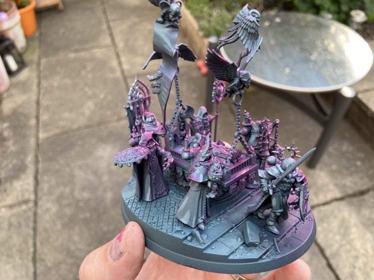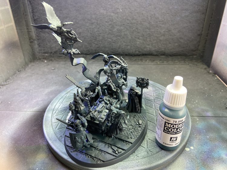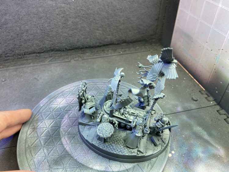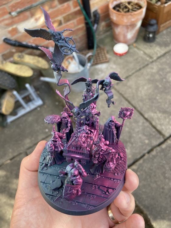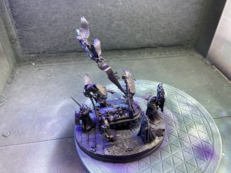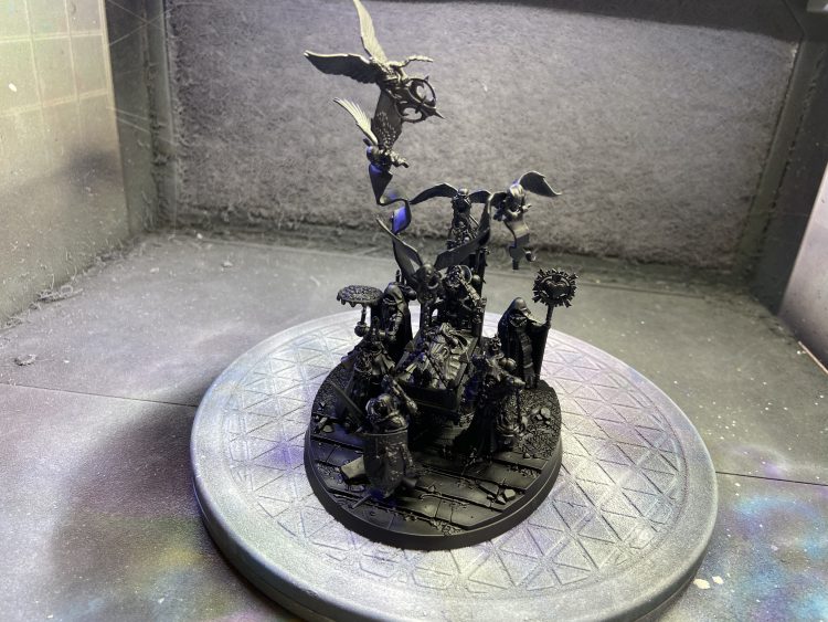 For this article I'll be painting the Triumph of St Katherine. I assembled the model and primed it black. I wanted to magnetise the individual models so I could remove them as they died, but wanted to get the lighting right with them in place so the piece looked like a complete model rather than individual ones stuck together. I primed the model Chaos Black.