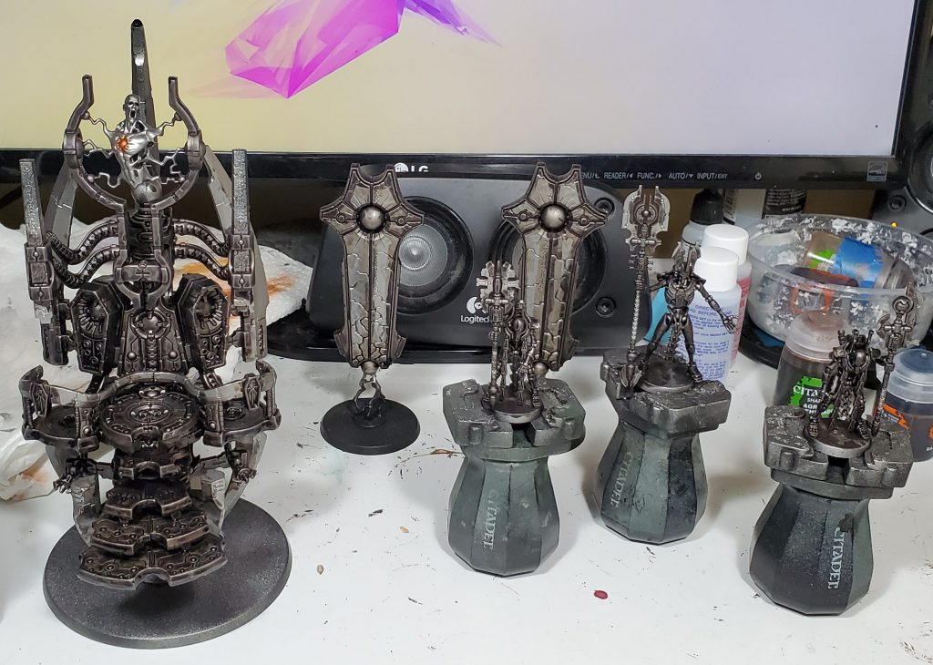 As usual for Necrons I started by airbrushing Iron Hands Steel on before washing the crap out of the main stuff with both Agrax Earthshade and Basilicanum Grey Contrast then drybrushing with ironbreaker. I also picked out some details with gore-grunta to get another metal colour on the characters.