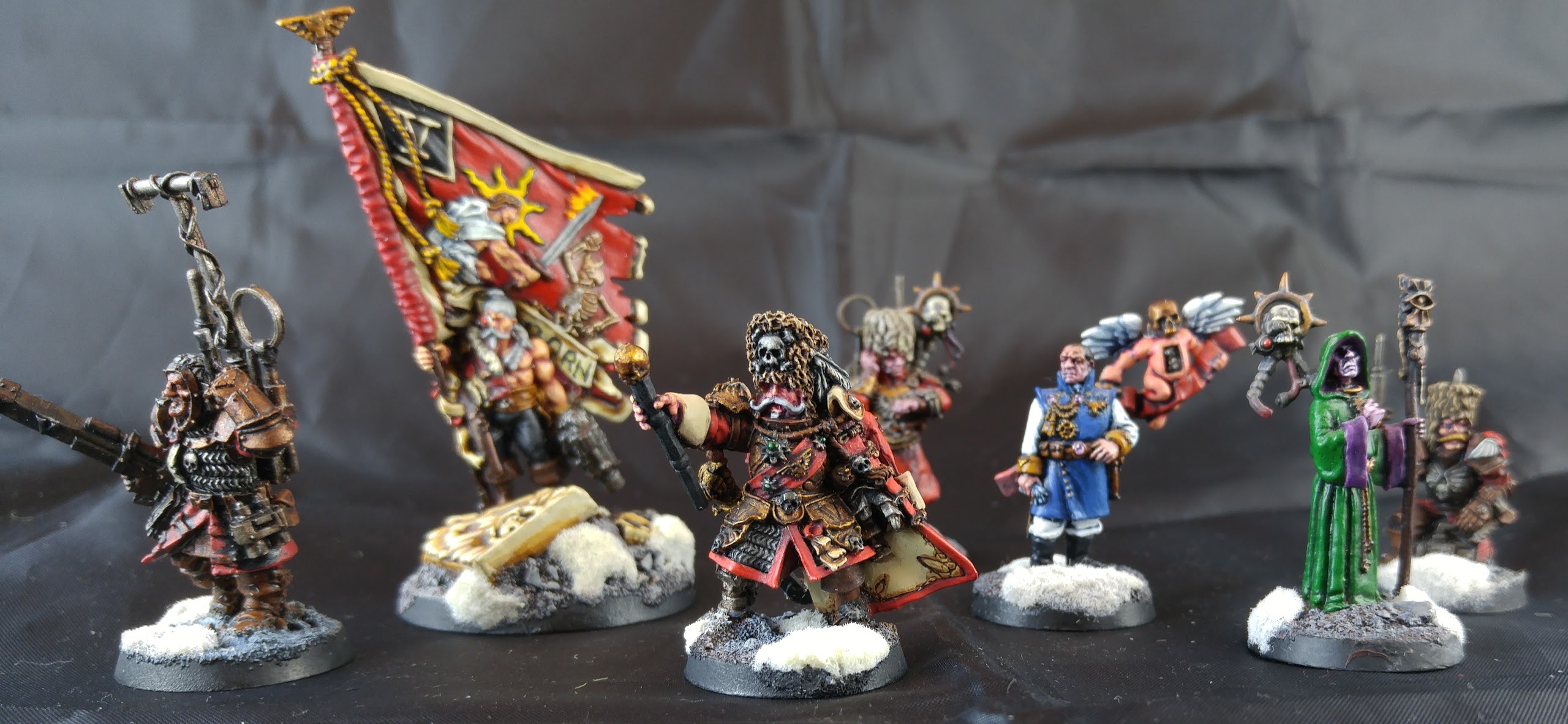 Red badges: Mephiston Red, Nuln Oil in the eyes and such, and Evil Sunz Scarlet highlights. With officers I tried to incorporate more red in sashes and such, painted the same way.
