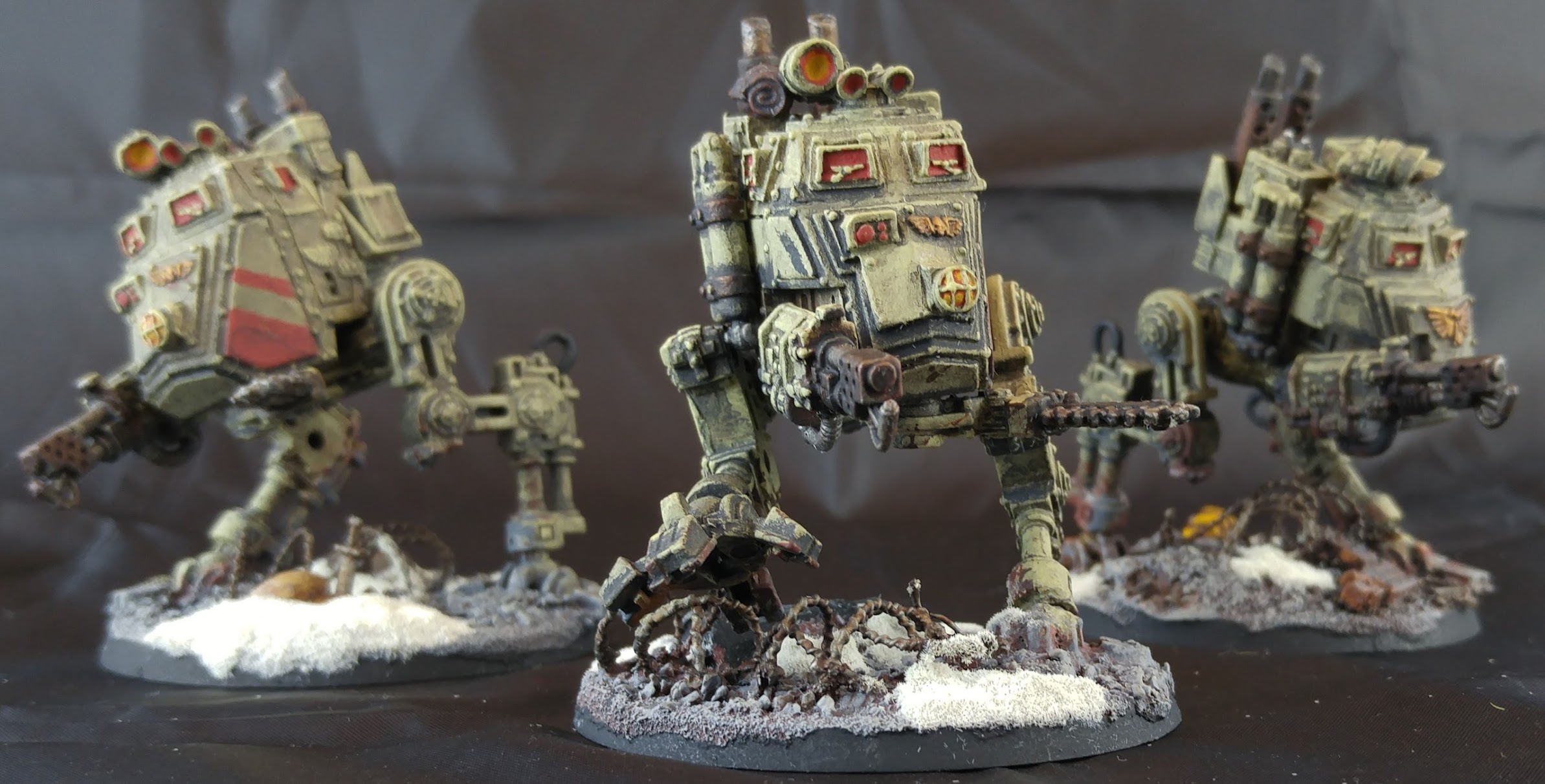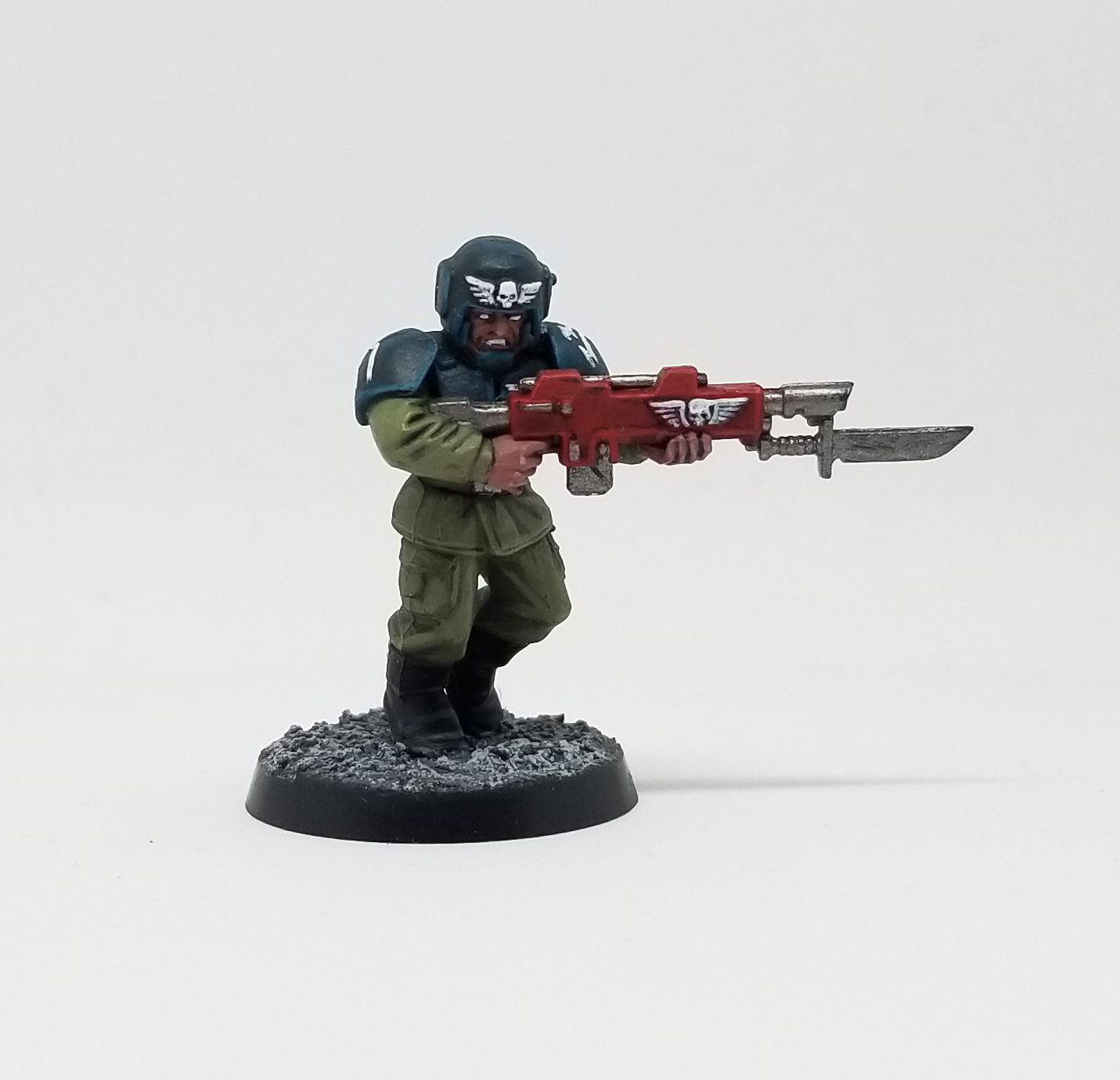 I had always wanted these guys as a kid after seeing the big spread of them fighting Tyranids in the 3rd edition rulebook, so one of the first things I did on getting a real job was buying up an army of them. They hit a wonderful balance of 90's simplicity, hand sculpted character, and realism that give them a certain timeless charm. For my Valhallan 32nd Rifles, I took inspiration from the same place as the Perry Twins did when they sculpted them - the Soviet Red Army from World War II. A quick disclaimer - if you're going to reproduce a historical scheme for a non-historical game, be mindful to avoid any explicit markings of the era. These guys have some red stars that are sort of generic enough, but I avoided the hammer and sickle or any real world unit markings. This is doubly true if you want to do a German-inspired army, in which case you should stop, breathe, and pick a new scheme.