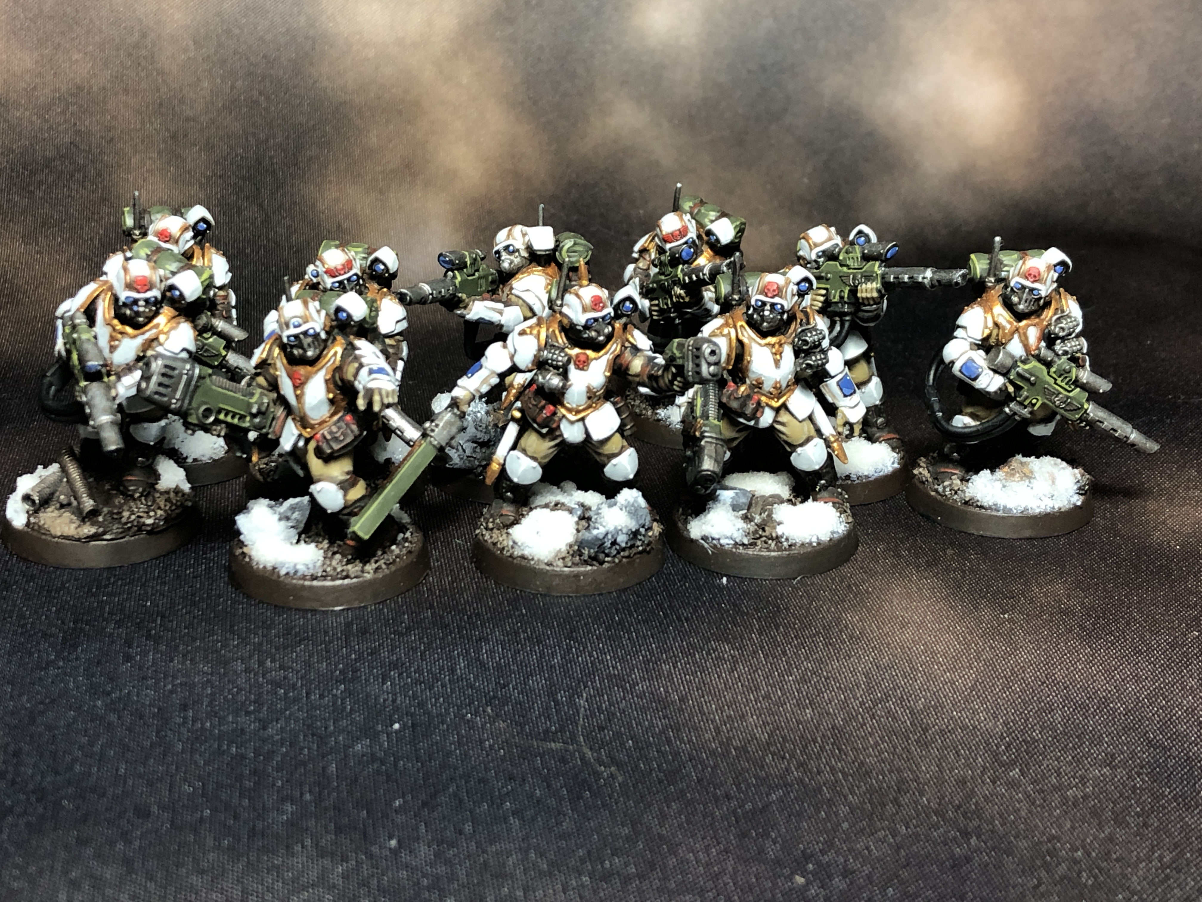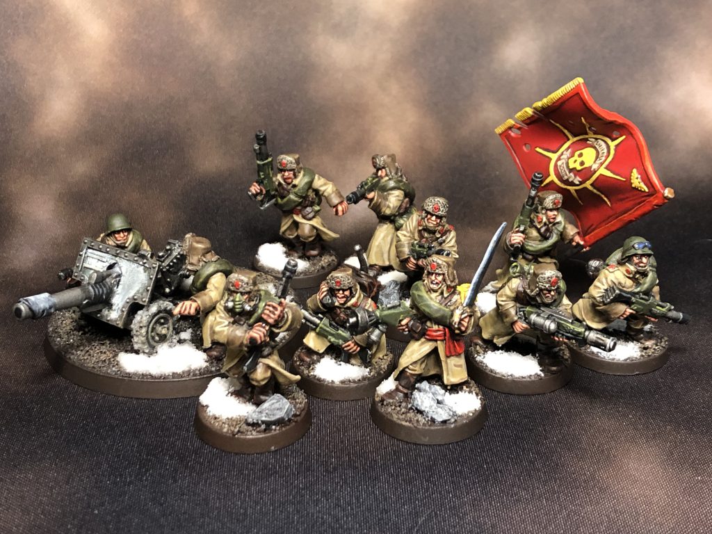 The Vostroyan Firstborn are a regiment who are sourced from the world Vostroya, an Industrial world who refused to send troops to aid the Emperor during the Heresy and instead opted to make a bunch of weapons. That was widely seen as a mistake, and since then the Vostroyans have agreed to send all of their first-born children to serve in the guard. They're yet another regiment modeled after Russians.