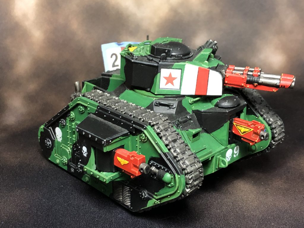 If you ignore the dust, however, you'll see a tank using the same color scheme as the infantry. I primed this tank with the same Army PainterGoblin Green spray as the infantry, then painted in camo splotches using P3 Thamar Black. If I were to do this again I would paint the whole tank with Warboss Green after the spray to even out the coverage and make cleanup easier. The black was highlighted the same as the leather on the infantry, as I didn't want the tank to get too blue, and the green was highlighted the same as the uniforms, with Athonian Camoshade being used sparingly on rivets and recesses. When painting camo, it's important to get clean lines, so using a slightly thinned down paint and a fine brush, draw the patterns in and fill them in later. Alternatively you could use another spray or airbrush and blu-tac or modeling putty to mask off areas, but you do you. The last detail here that isn't on the infantry is the striping on the side of the turret, which was just the same red recipe as before, then Ulthuan Grey with a Corax White highlight, and lines of Thamar Black dividing them. I painted this whole scheme before airbrushes were quite as mainstream as they are now, but I imagine using one would make quick work of an army of these folks without repeating my mistakes.