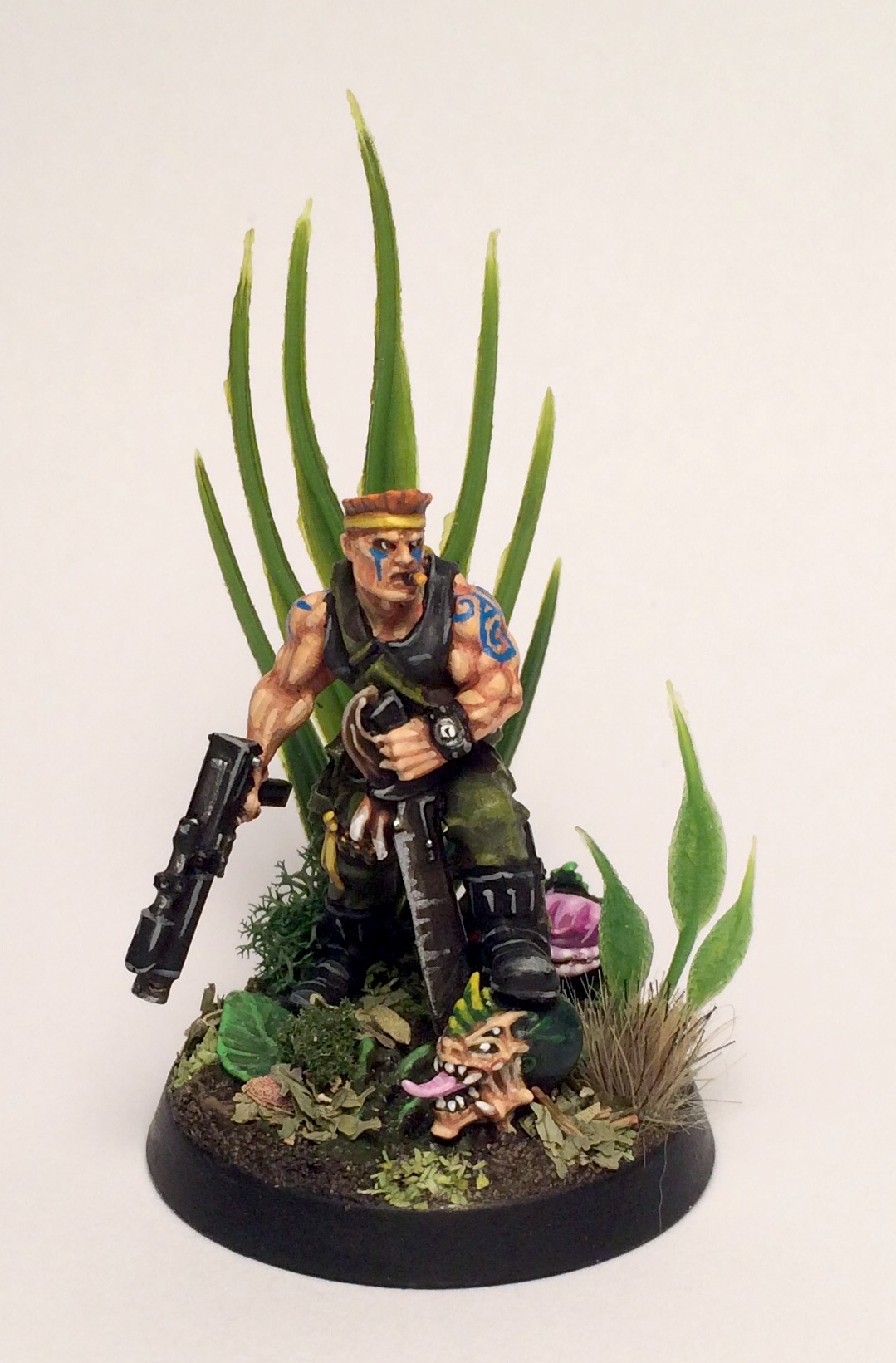 BuffaloChicken's Catachans are well known around the Goonhammer offices, as we've long talked about the way he incorporates beautiful conversions into his efforts. In addition to using a pet store's worth of aquarium plants on his army's bases, he also frequently rescues old toys (particularly dinosaurs) to use for terrain and conversions. His Catachans have a lighter, painterly feel.