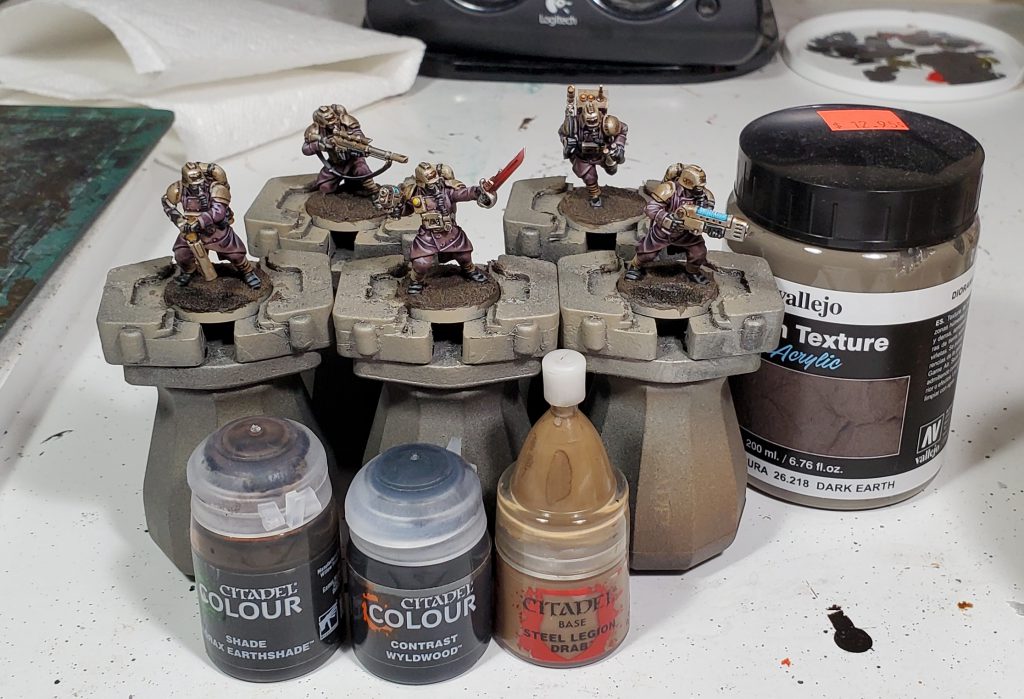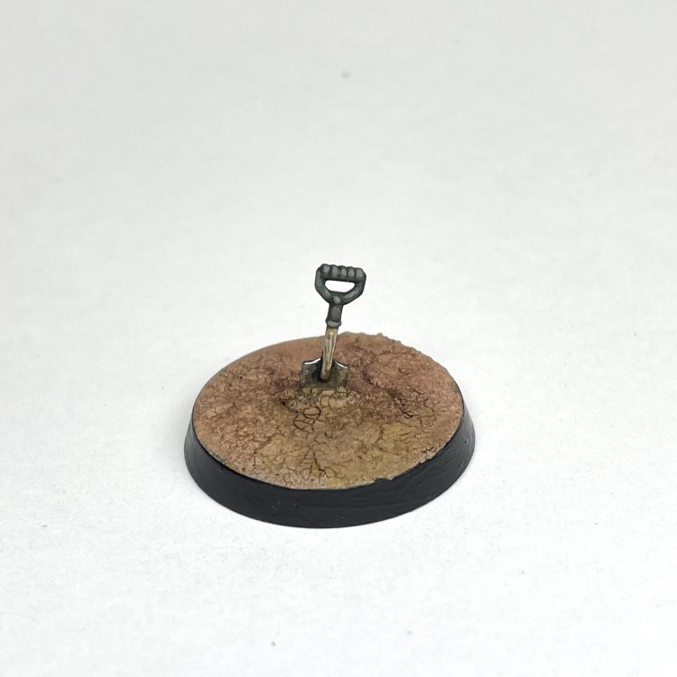 Drybrush the dirt with Steel Legion Drab followed by a lighter drybrush of Gorthor Brown (optional: do a final light drybrush of Ushabti Bone)