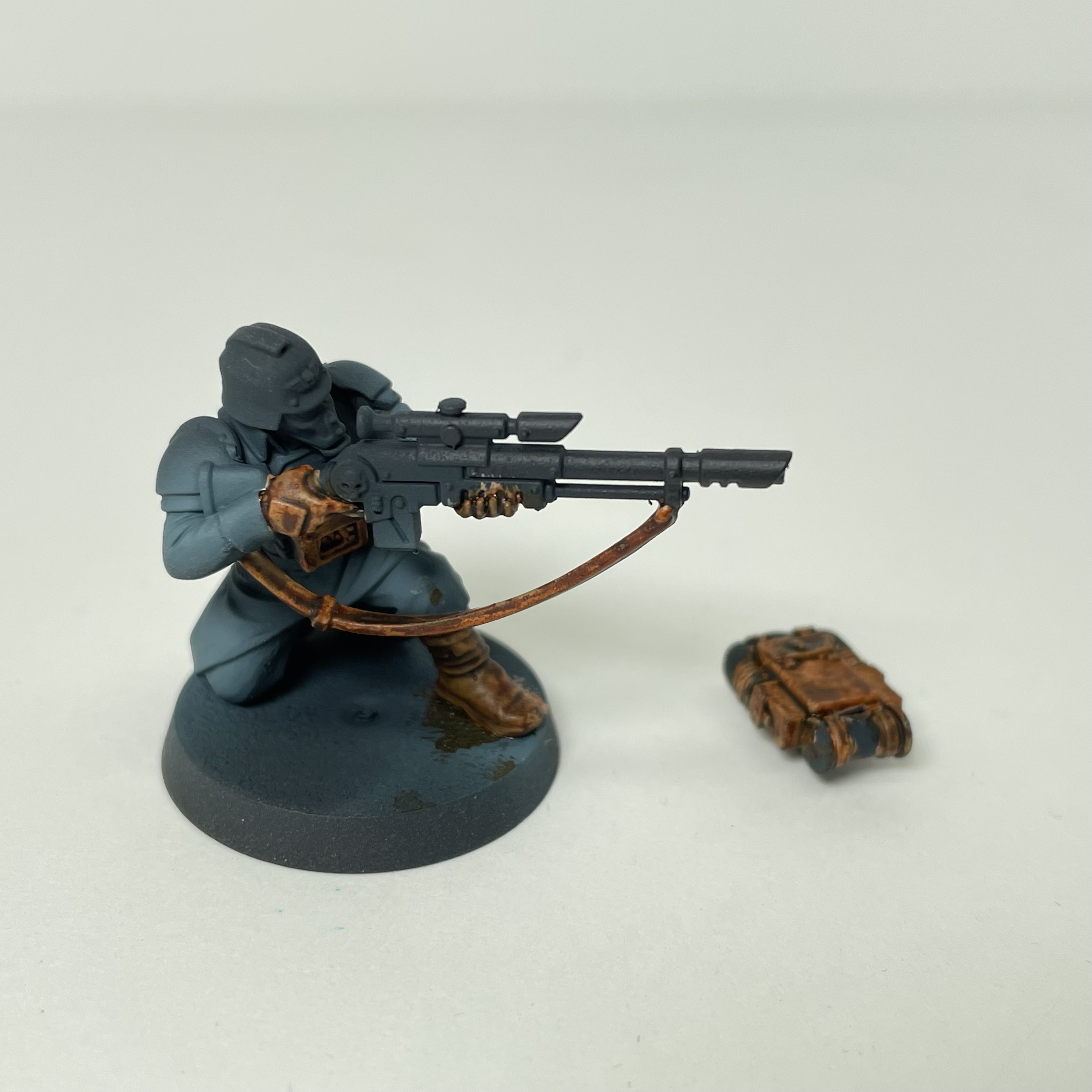 Stowage: I painted this the same as the Valhallan pants. Steel Legion Drab, Tallarn Sand, Agrax Earthshade wash. Leather straps the same as the boots and straps on the infantry - Rhinox Hide, Agrax Earthshade, and Doombull Brown.