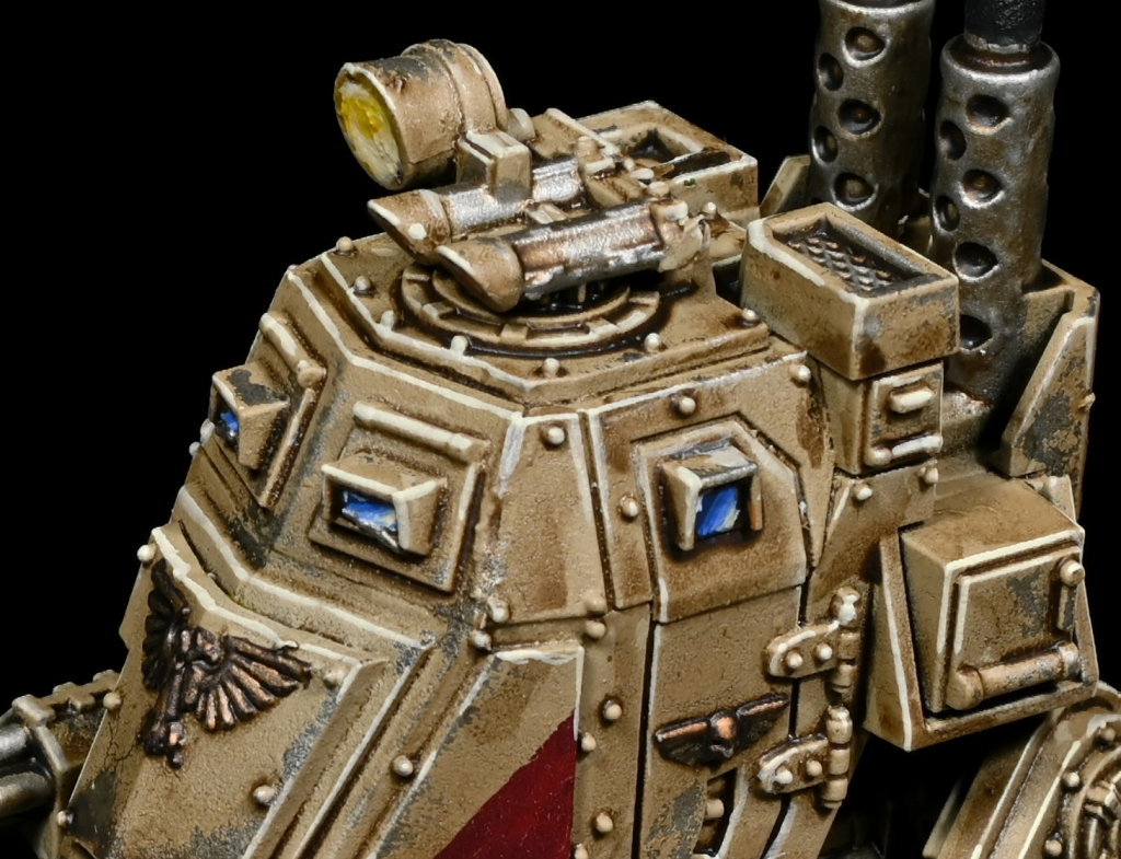 Weathering: Back to drybrushing! We'll go back to that same trinity of browns, drybrushing Steel Legion Drab up to around the halfway point, Tallarn Sand up to around a third, and Karak Stone up to a round a fifth of the way up.