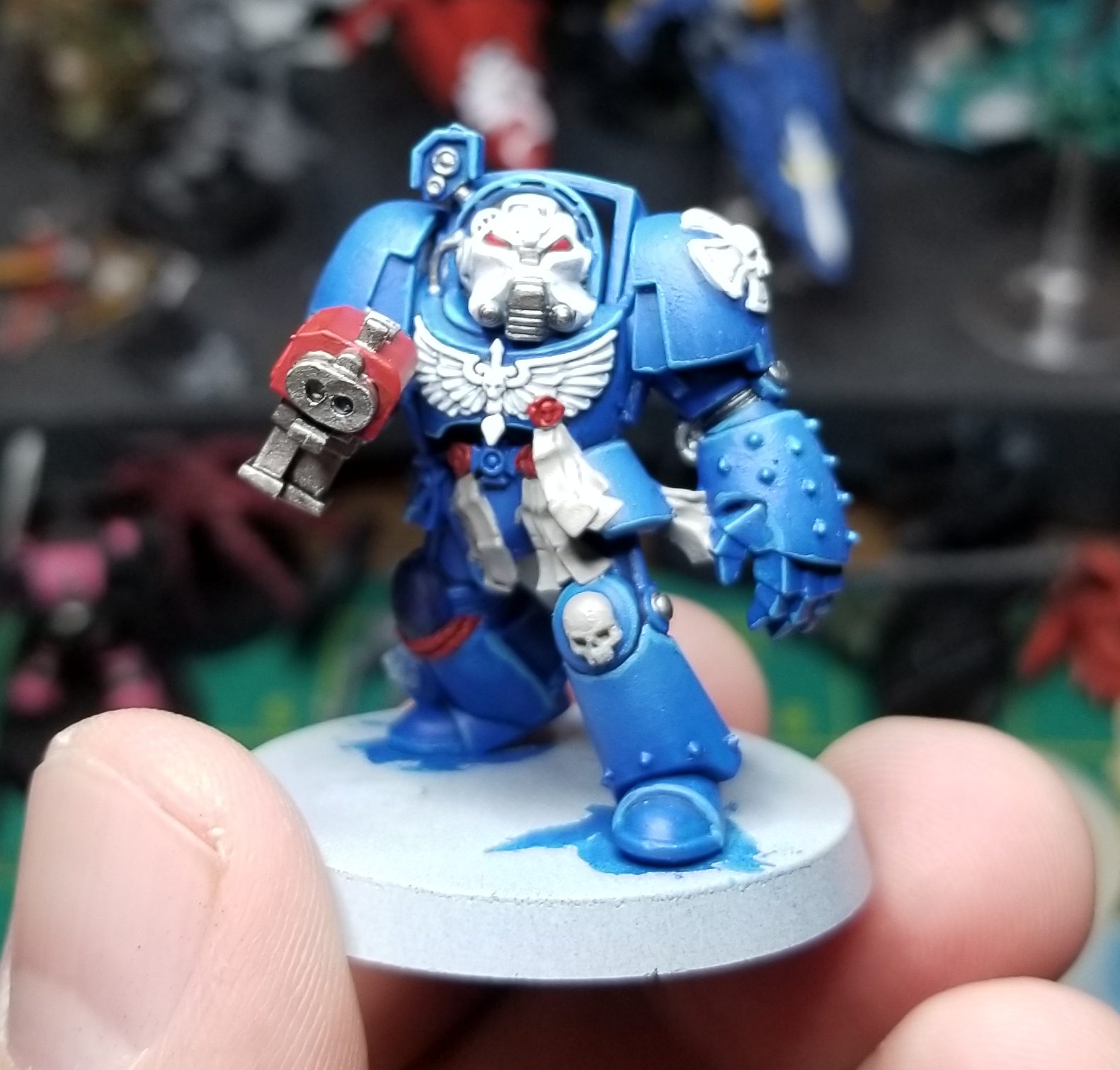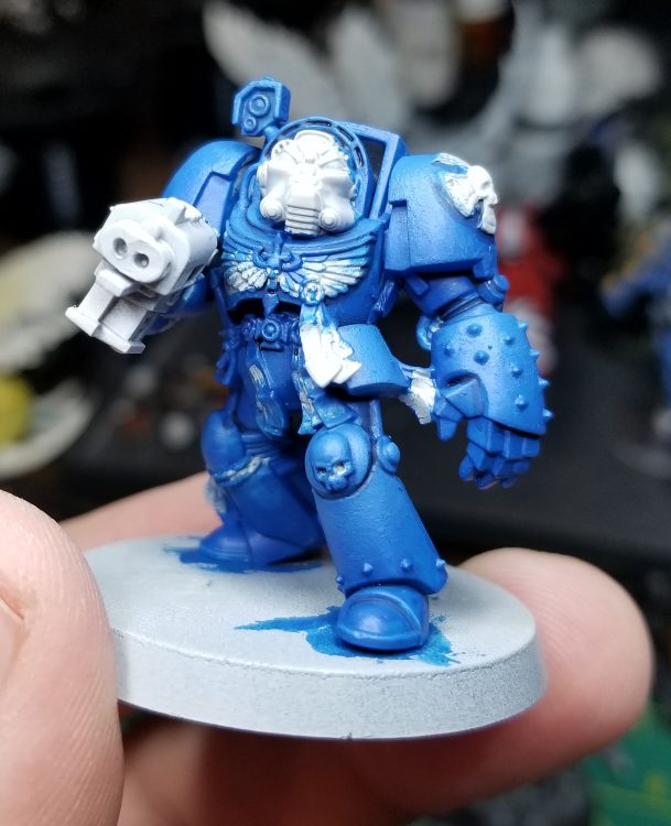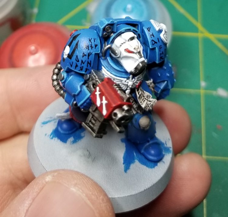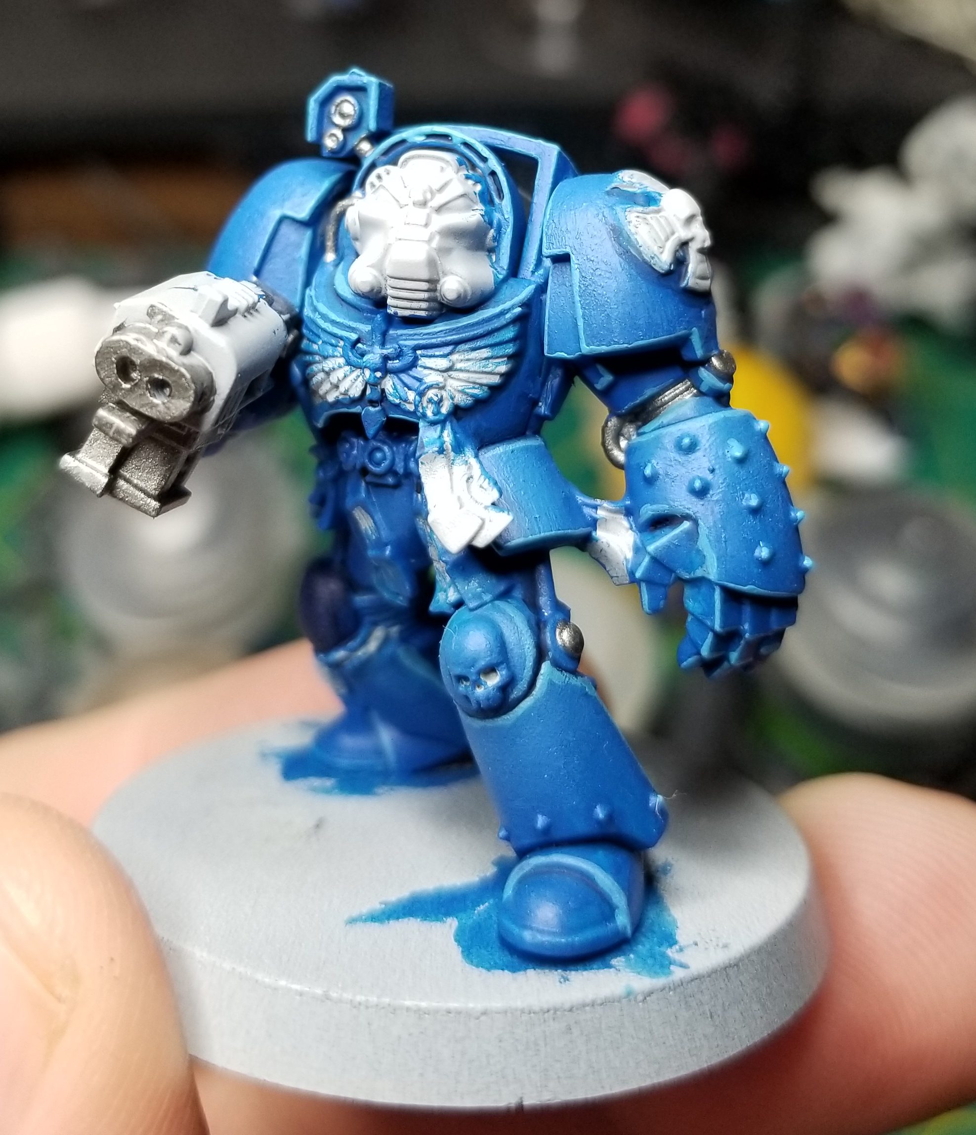 I've been working on an Emperor's Spears model for my Deathwatch Bladeguard Veterans but that didn't really seem like a good fit for a How to paint Everything that very much wanted to have the chapter's signature blue armor. So I dug around in my bitz box and found an old Dark Vengeance Terminator that didn't have too much Dark Angels stuff on it, filed off the shoulder pad icon, and got to work on a real Emperor's Spears paint scheme.