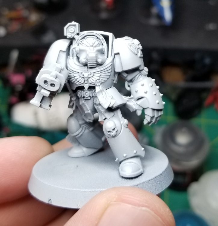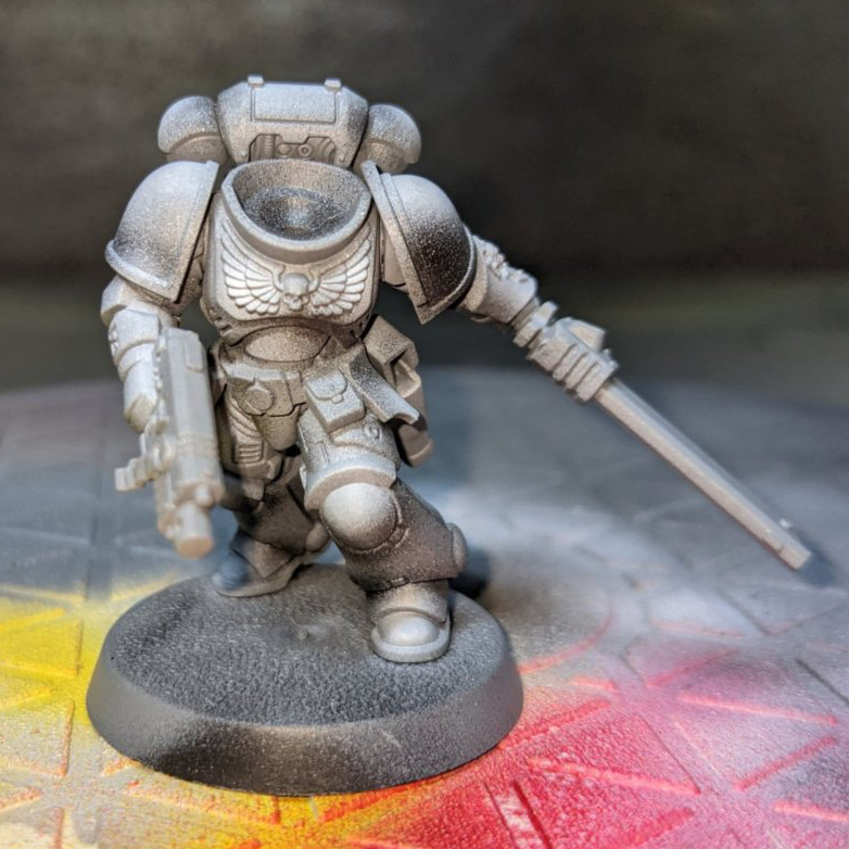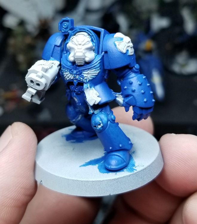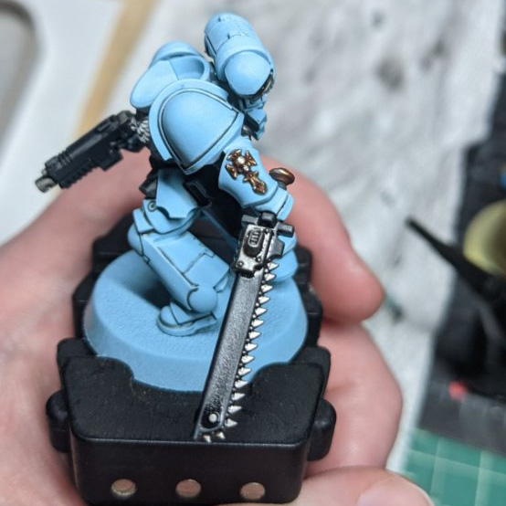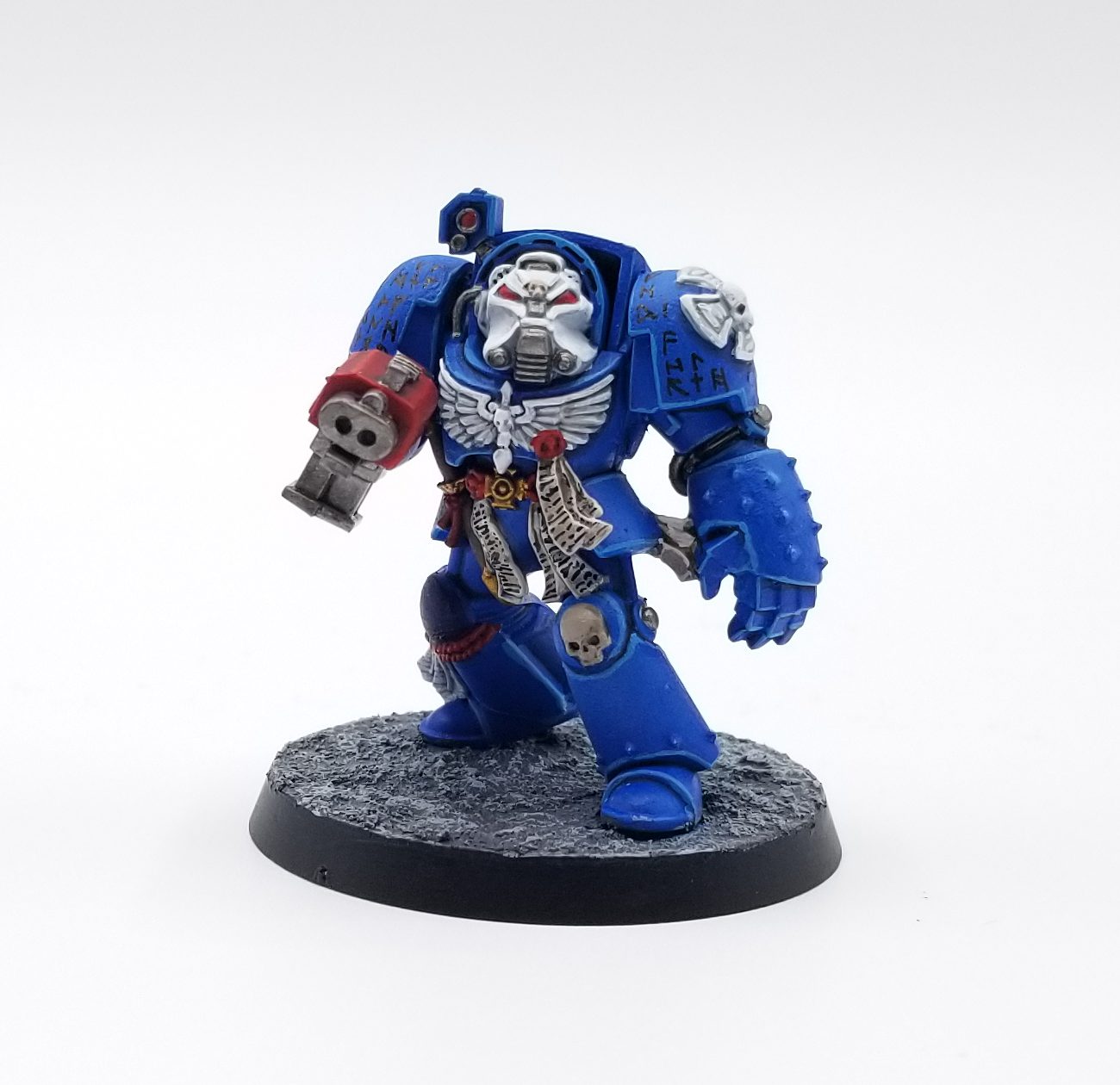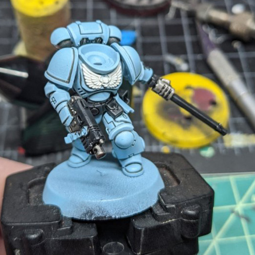 I've been working on an Emperor's Spears model for my Deathwatch Bladeguard Veterans but that didn't really seem like a good fit for a How to paint Everything that very much wanted to have the chapter's signature blue armor. So I dug around in my bitz box and found an old Dark Vengeance Terminator that didn't have too much Dark Angels stuff on it, filed off the shoulder pad icon, and got to work on a real Emperor's Spears paint scheme.