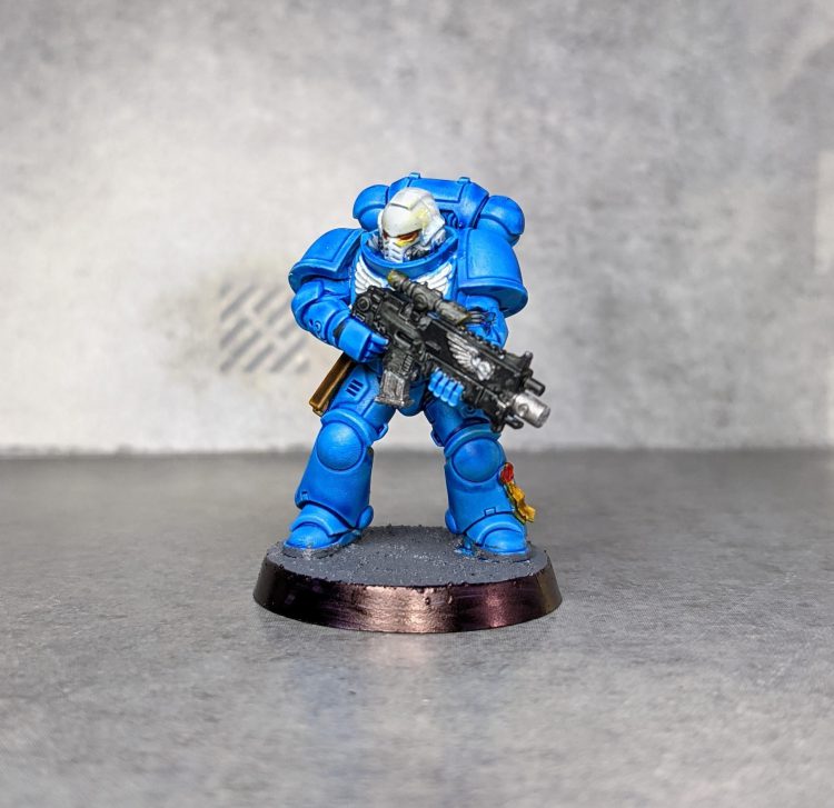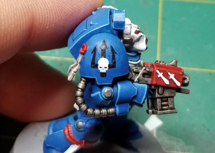 Some time later, TheChirurgeon finally broke through the barricade that had accidentally been made on my side of my office door and gently prodded me into adding a little more polish to the model. So I added a touch of Contrast Ultramarine Blue to the knee pad, applied some transfers, and made a ham-fisted attempted at some highlights with a drybrush of Corax White before a wash of Contrast Apothecary White.