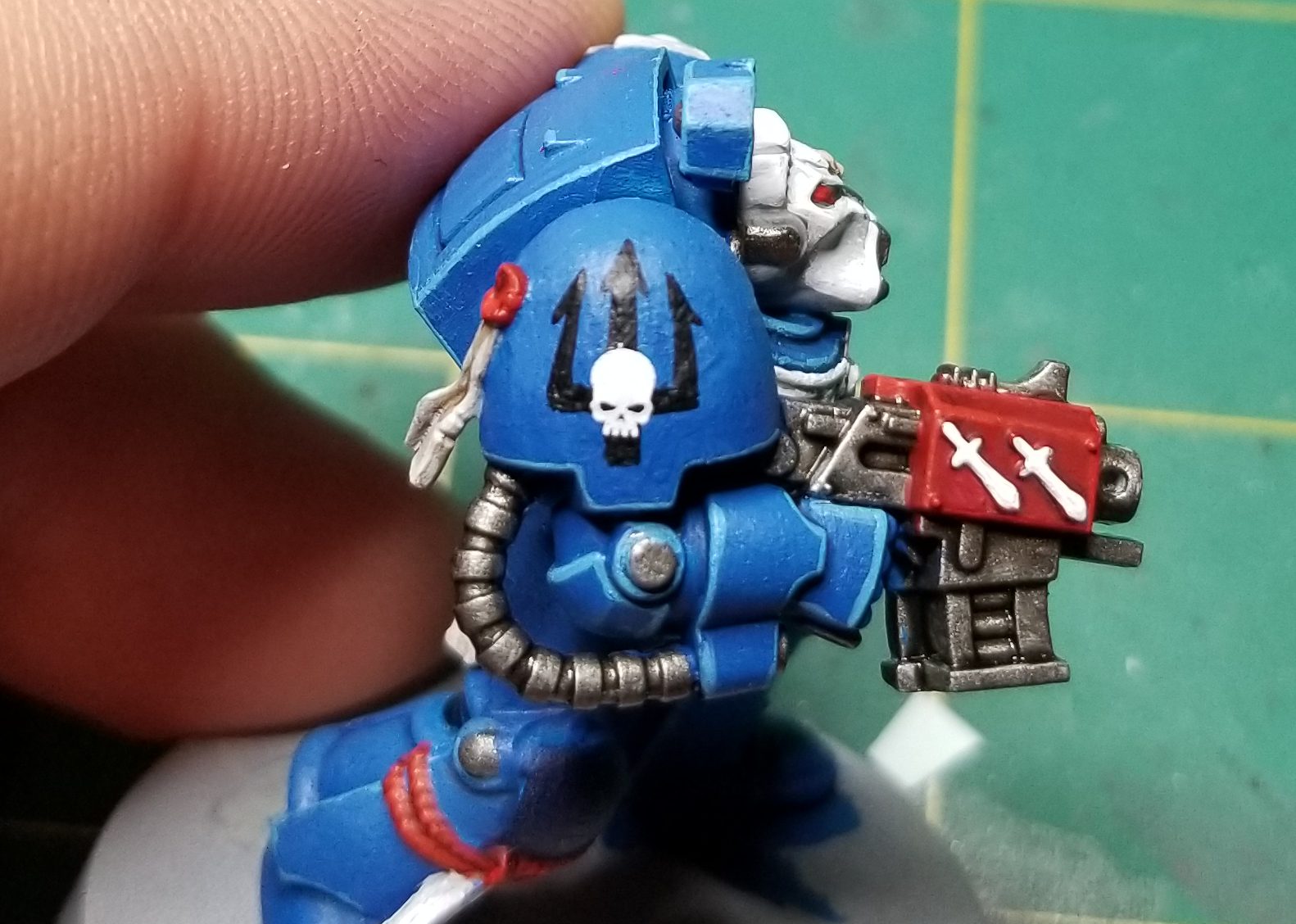 Time for the shoulder pad. I freehanded the trident - start by sketching out the basic shape by doing the three lines, then thicken them up and add the spearpoints on the trident - then rather than try and freehand a small skull, I just cut one out of the transfers on the Ultramarines transfer sheet. This can be a bit of a paint, since that requires cutting away the yellow circle around it (or painting over that part, but also keeps the profile of the skull pretty small so it's easy to apply to a curved surface.