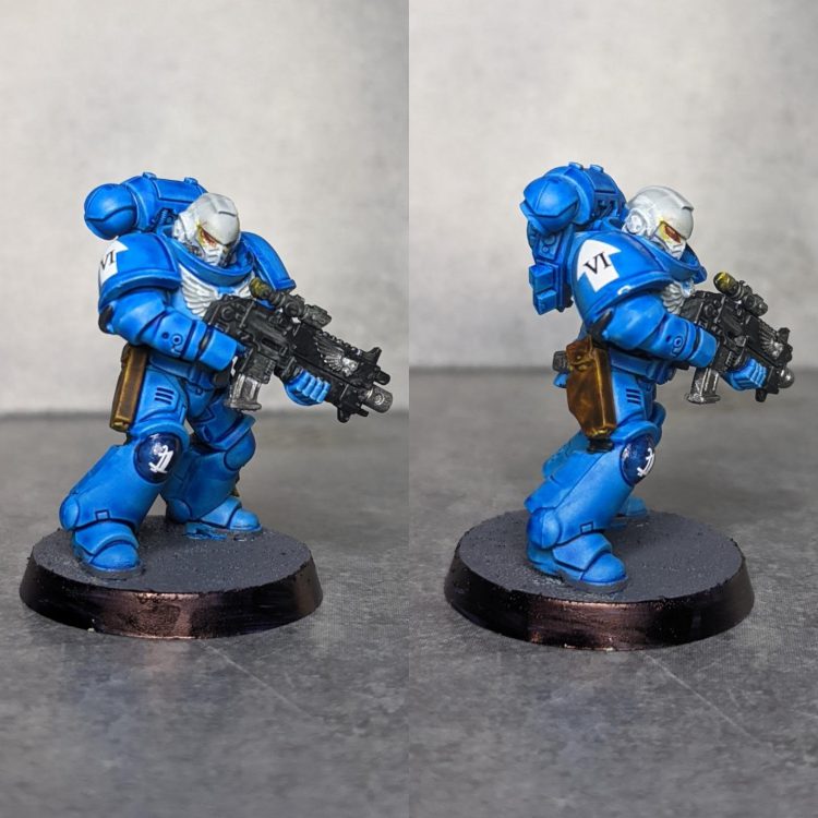After that I did a quick tidy up with some Corax White and picked out some details with Army Painter Plate Mail and then picked out the lenses and seal with Contrast Blood Angel Red and the leather pouches with Contrast Snakebite Leather.