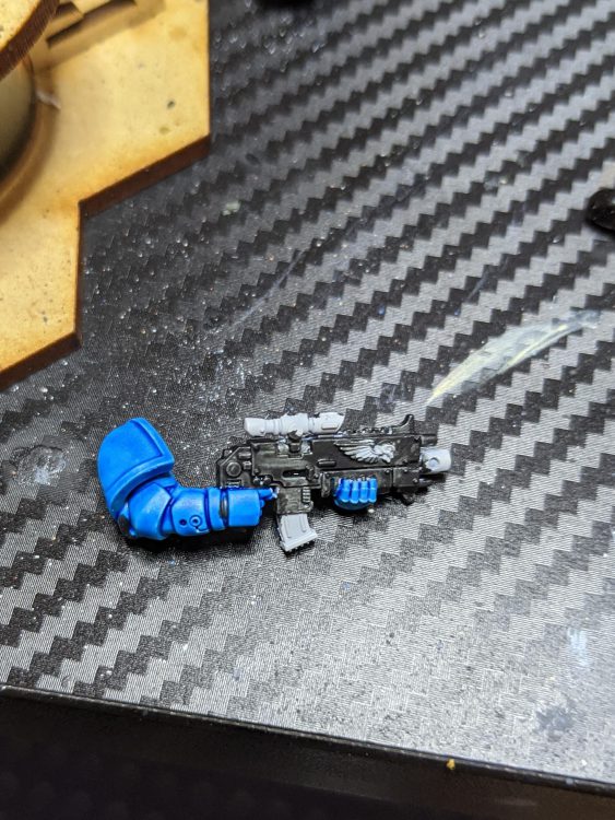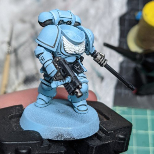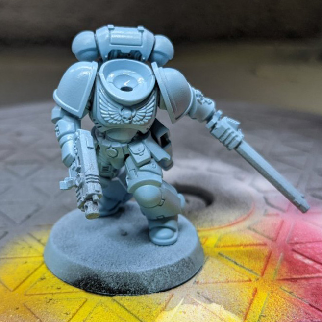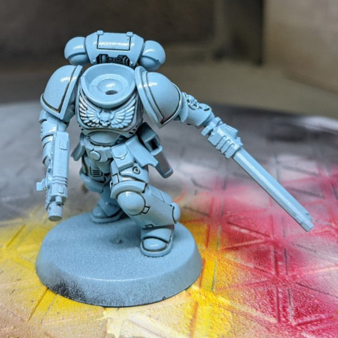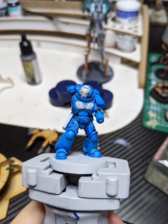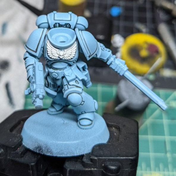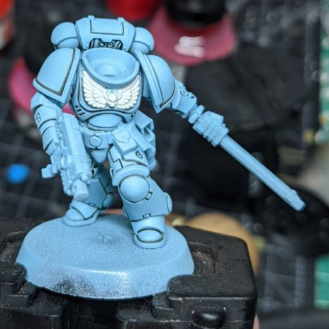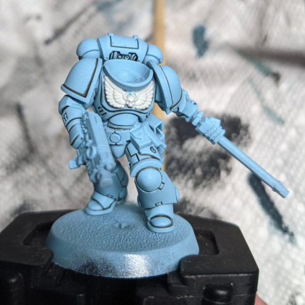 - Start by priming grey and throwing a quick black/white preshade on. The blue is surprisingly opaque, so you can get very contrasty here.