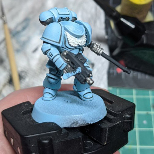 Edge highlighting time! I use Lothern Blue for y edge highlights here (I'll come back and touch up some of the rougher areas later), and paint the right kneepad with a coat of Night Lords Blue to give a darker matte color.