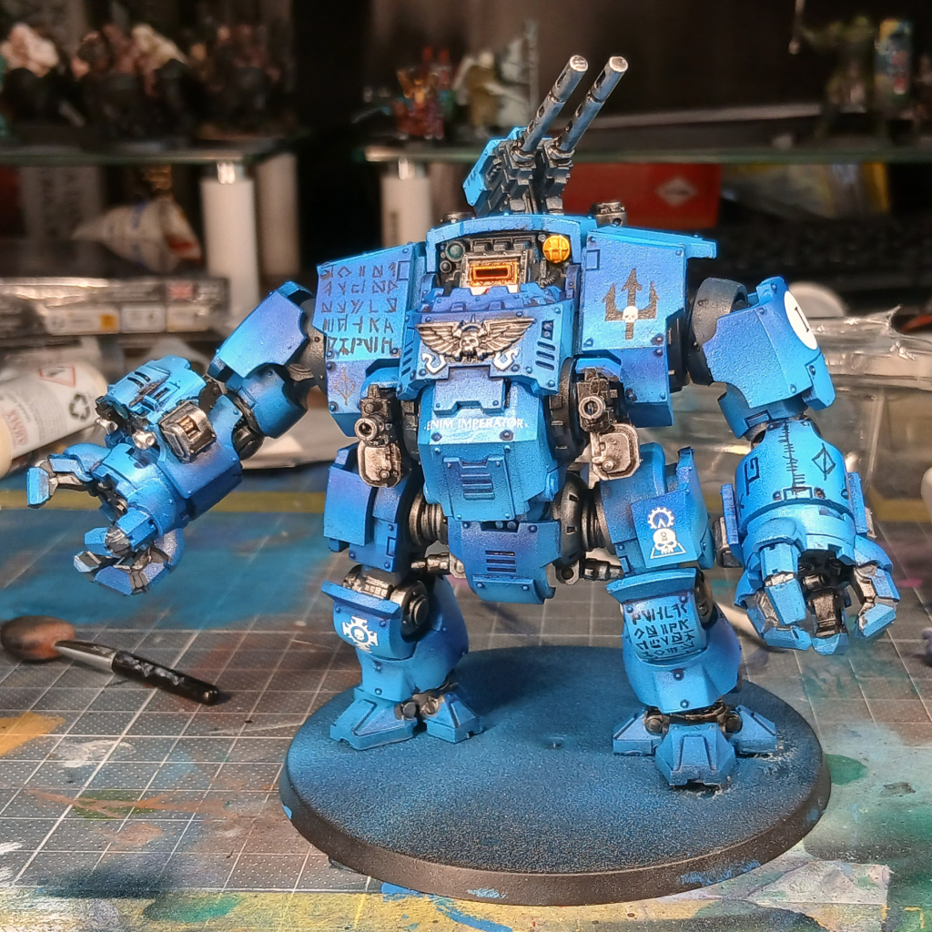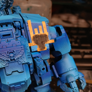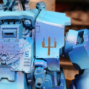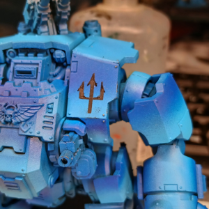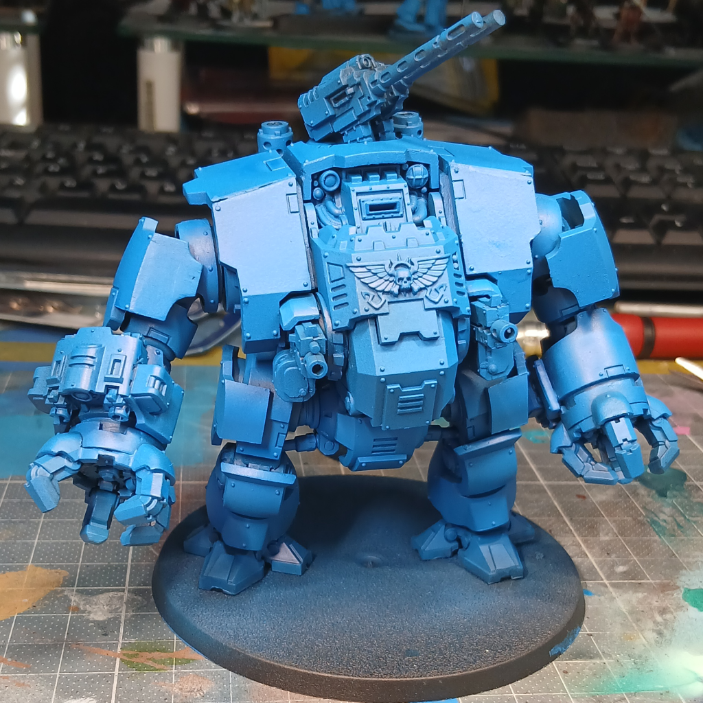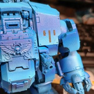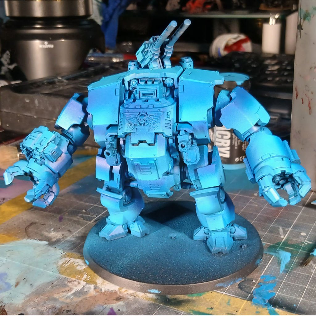 For the second step I used a piece of plasticard as a mask and did some panel modulations with ProAcryl Sky Blue (Army Painter Air Ionic Blue). I did this by holding the plasticard up against the sharp line separating each panel and spraying the lighter blue towards the bottom of each panel, so that the darker blue remains towards the top. This is a bit fancy and not realistic, but it does at least look cool on this Brutalis Dreadnought.