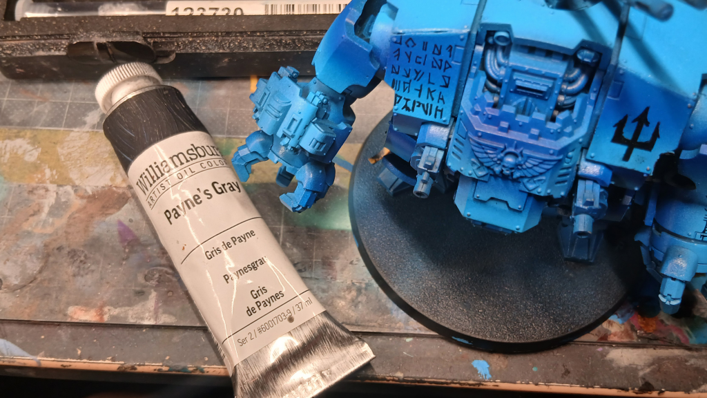 Skip forward a bit and with the metals and what-have-you painted, I oil-washed the armour with Williamsburg Payne's Grey. This is quite an expensive paint but the result is very beautiful, perfectly blue-grey. Once the white spirit evaporated away, I cleaned up with sponges and cotton buds.