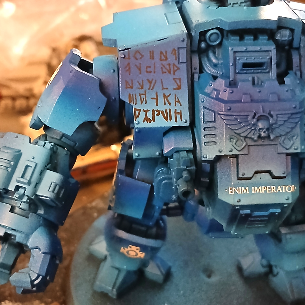 I also used the same Fineliner Pigment marker to draw the Nemetese Ogham runes on various parts of the Dreadnought's paneling. The letters aren't as neat as I would like them to be, but I will probably go back later and sort them out with some edge highlights.