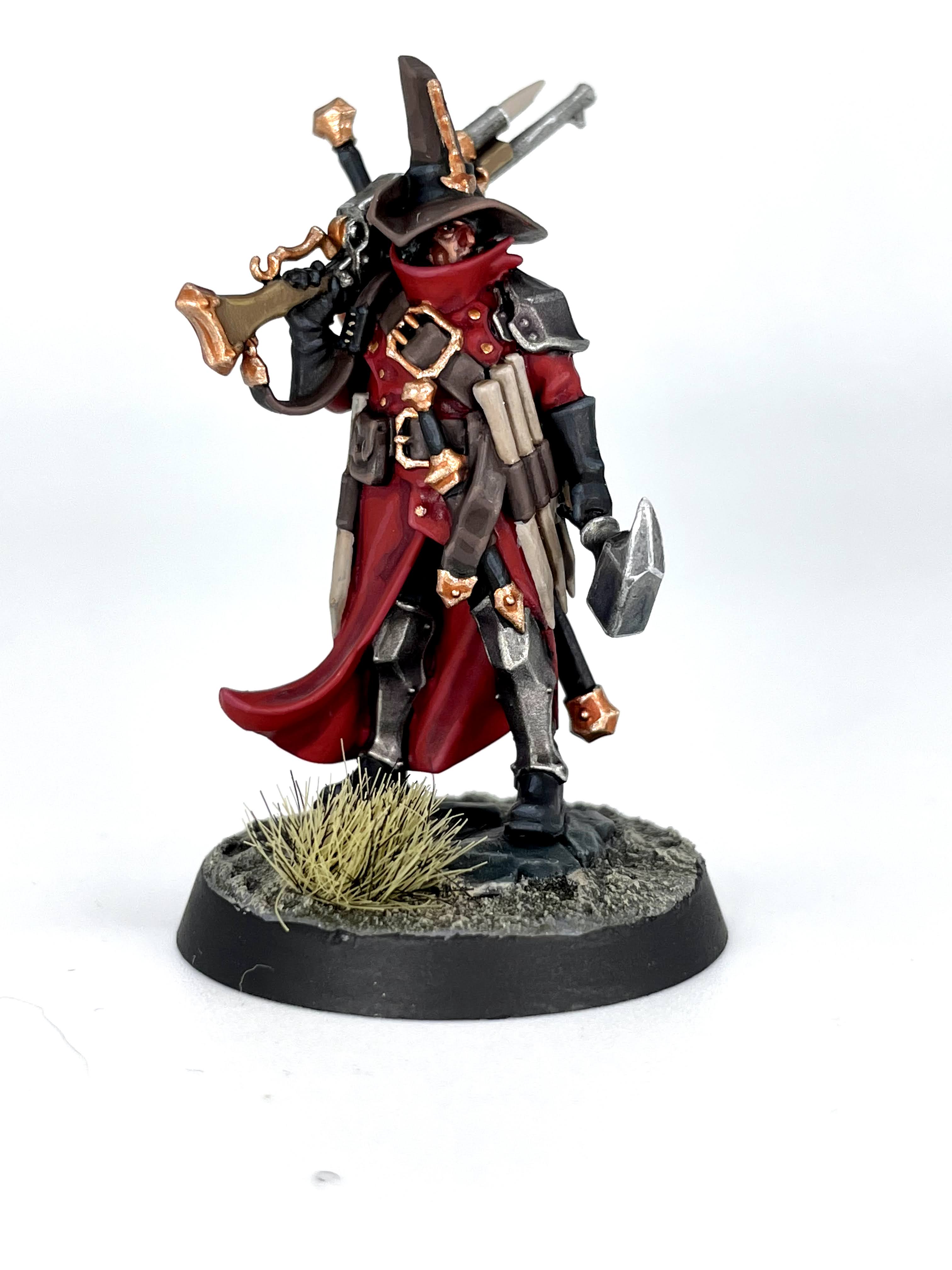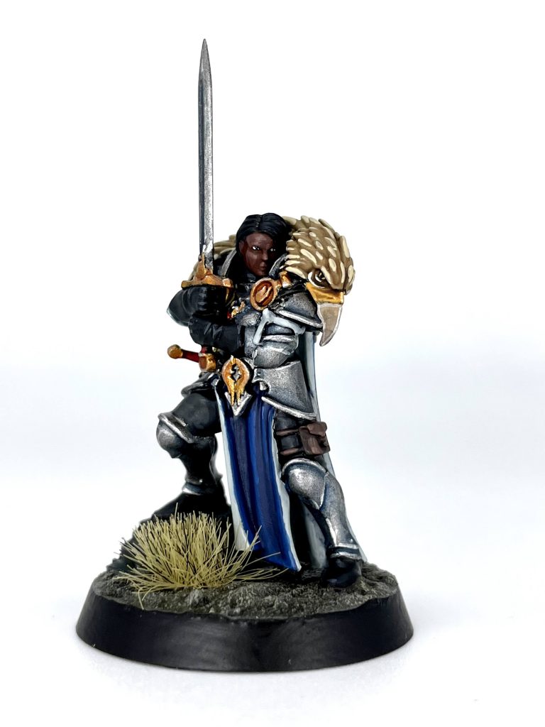 Emelda Braskov. Credit: SRMFirst I'll go through the parts of her paintjob unique to her, then refer back to techniques that I used elsewhere. You're good starting either with the armor or cloak on her, as they're both pretty huge parts of the model and are without a doubt the dominant textures on display. I also use a more "heroic" gold on her, as befits her paladin vibe. I give a pretty vague instruction for how to paint gems here, for the real masterclass on that particular bugbear check out this Goonhammer article that goes way more in depth than I can go here.